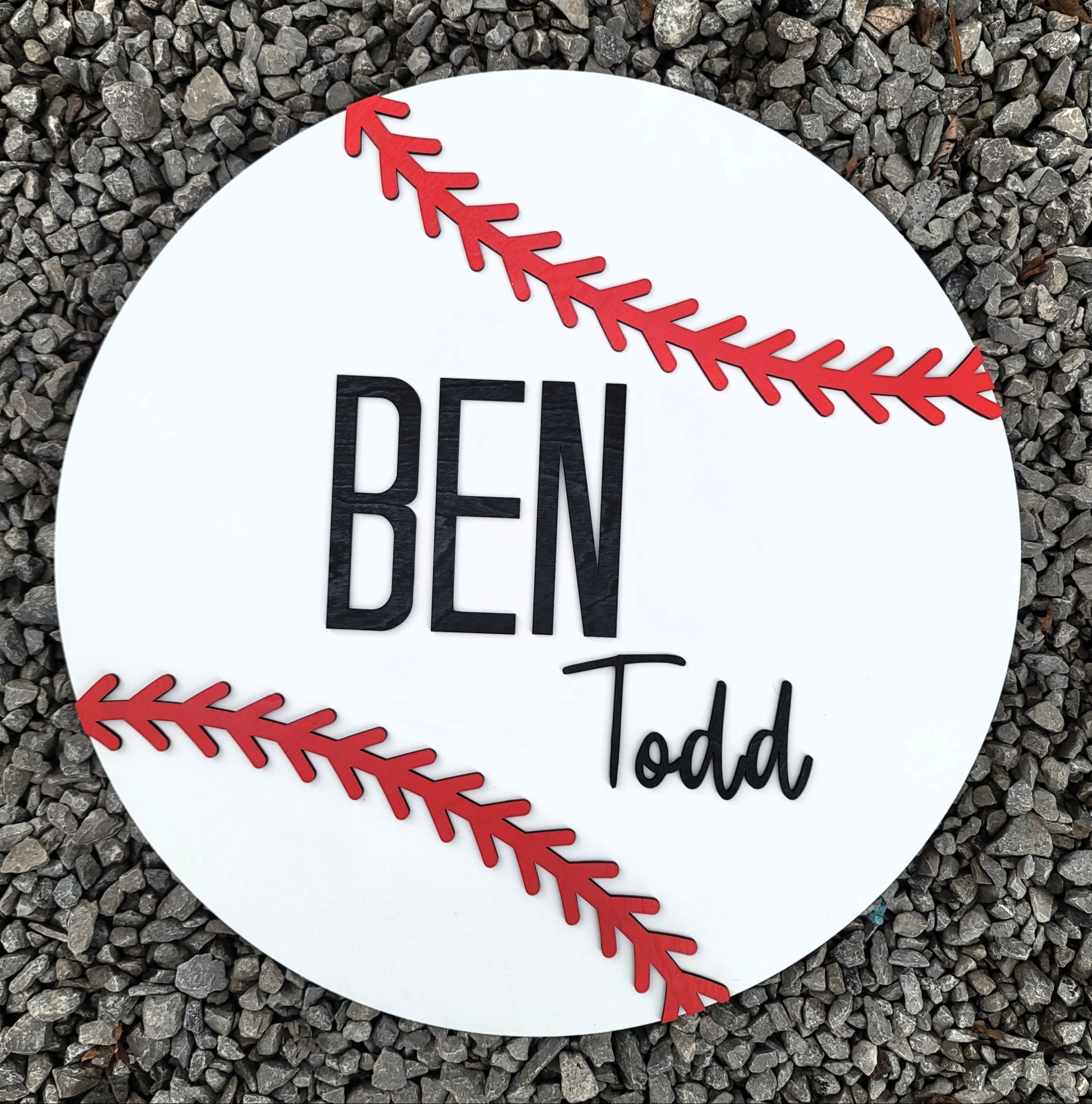 Beautiful, high quality 3d bedroom sign that can be hung with double sided command strips as it is very light weight. The sign is available in 22" diameter OR 24" in diameter & is pictured with a white background, black lettering & red baseball stitching. These letter are all 3d and are raised from the sign backing to give it a unique look. This would make a awesome gift!