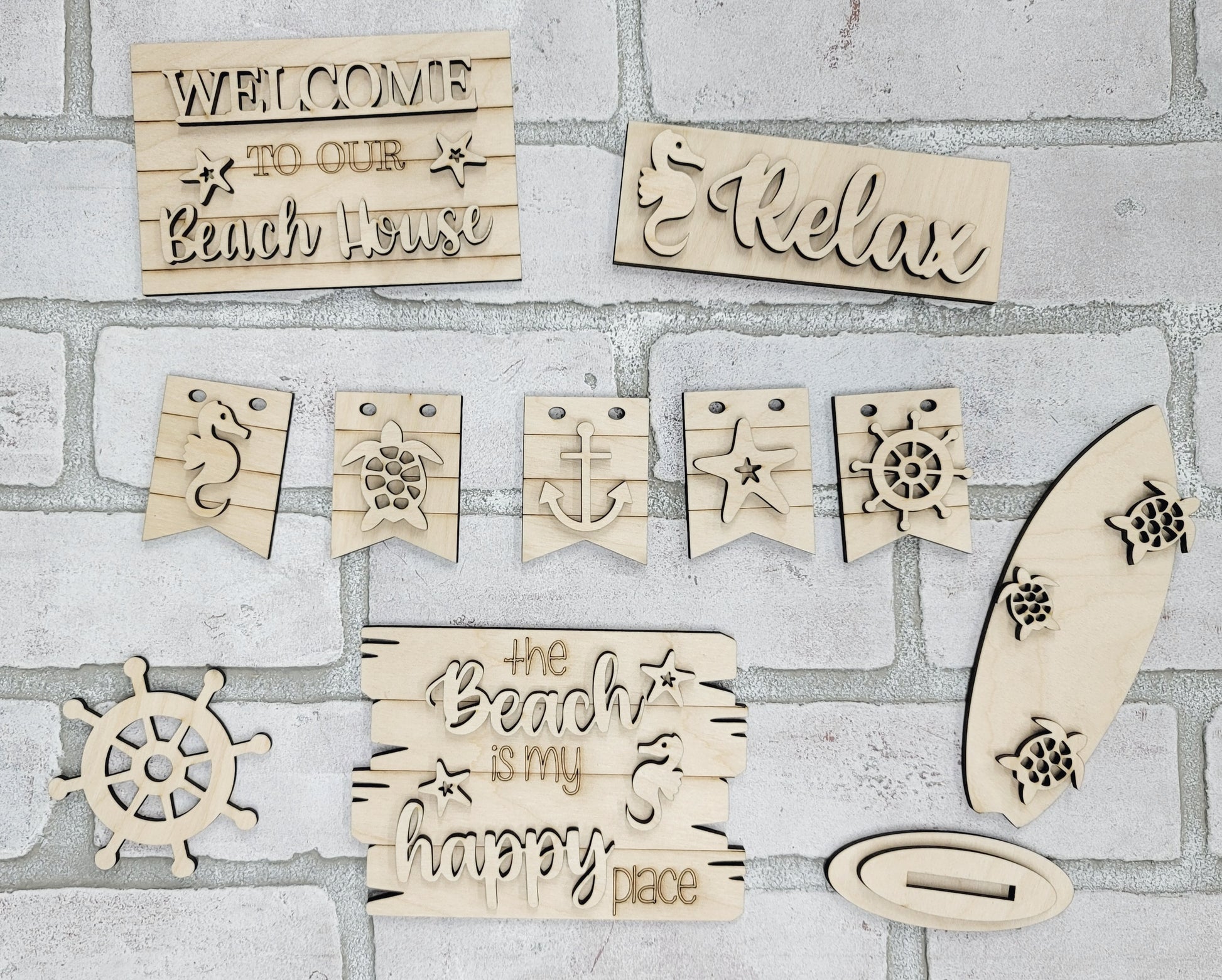 How adorable is this beach house tiered tray set?! This would make the perfect summer addition to any room! This is a 6-piece set (wood pieces only- no props or tray) and is made with 1/4" wood. Each piece has different 3D elements. This is offered as a painted set or a blank set if you're feeling crafty or you're wanting to plan a girl's night!