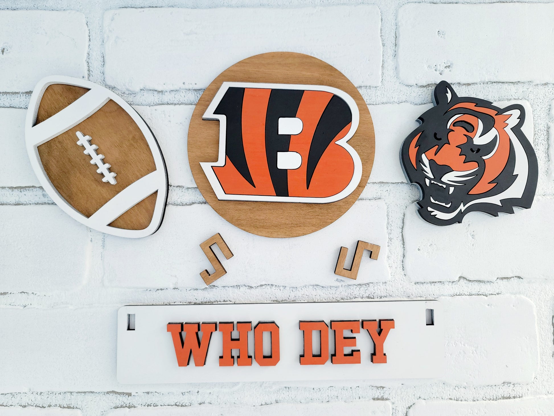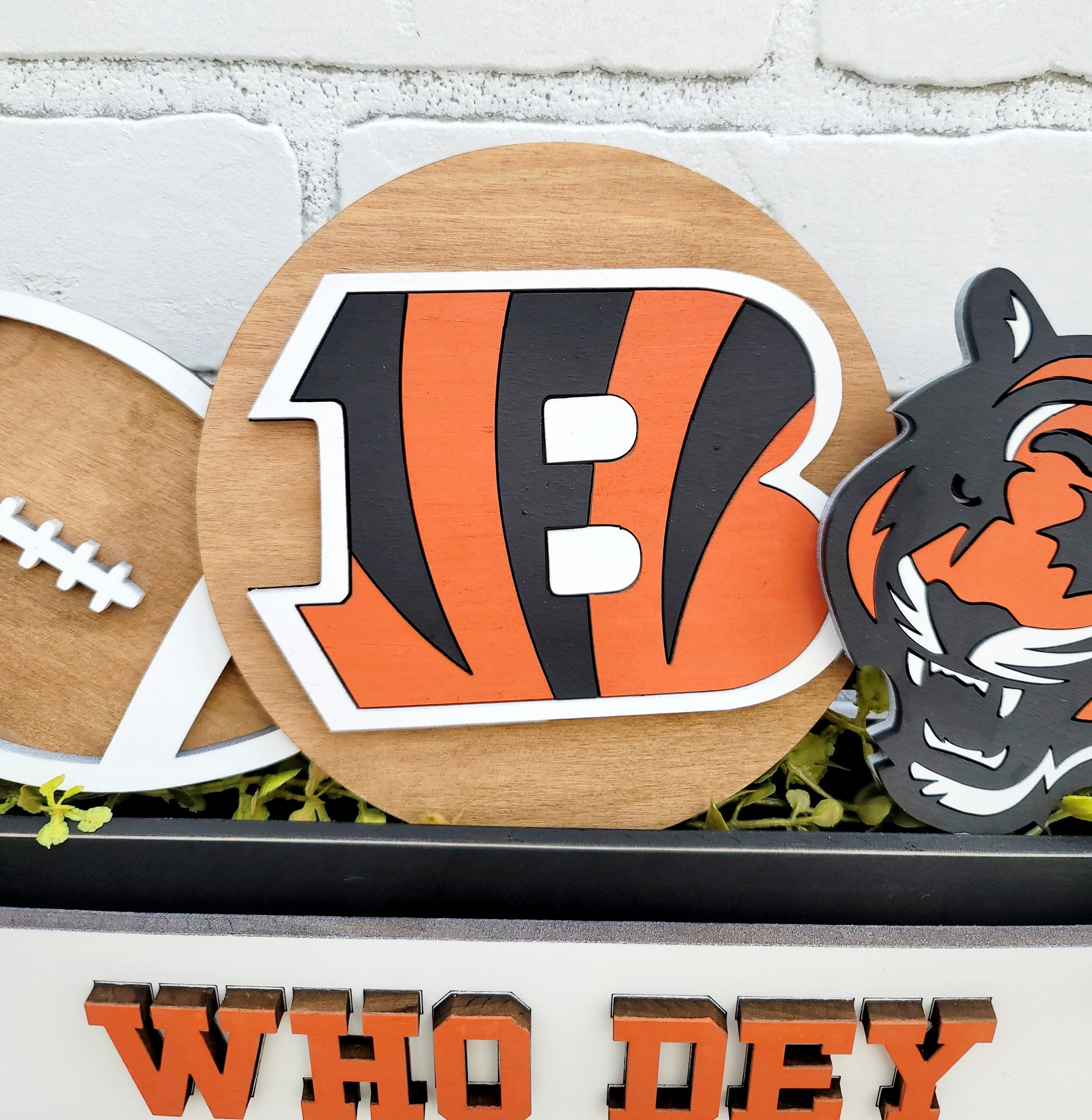 Bengals fan!? Perfect addition for your interchangeable crate/shelf sitter if you're a Bengals lover! This set includes 4 pieces and the hooks to hang the Who Dey sign. These are offered painted or as a DIY Blank option for you to paint however you would like. This listing is for the inserts only. Crate/Shelf Sitter sold separately.