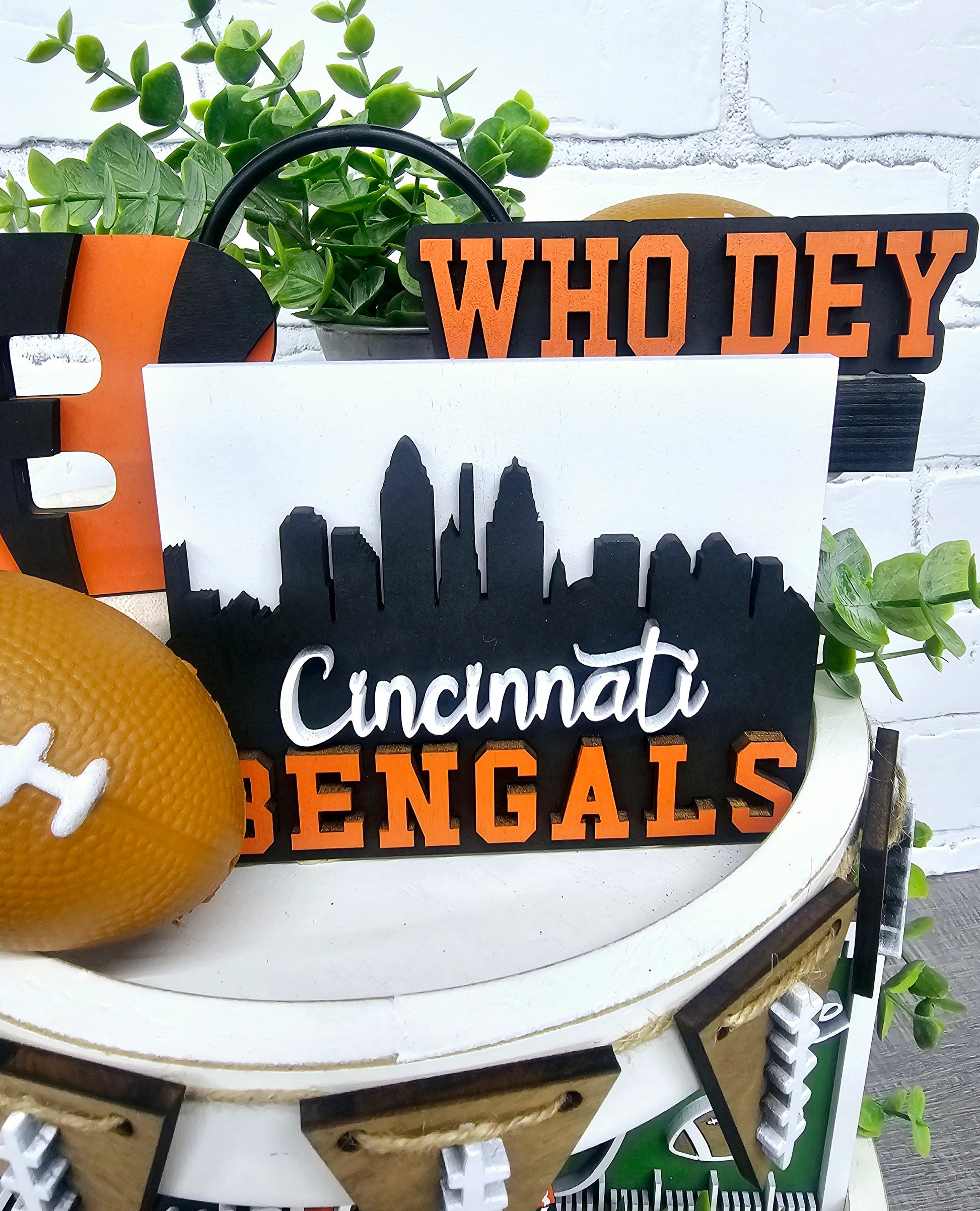 How adorable is this Bengals tiered tray set?! This would make the perfect addition to any room for football season!! This is a 7-piece set (wood pieces only- no props or tray) and is made with 1/4" wood. Each piece has different 3D elements. This is offered as a painted set or a blank set (blank set is all wood pieces ONLY) if you're feeling crafty or you're wanting to plan a girl's night!