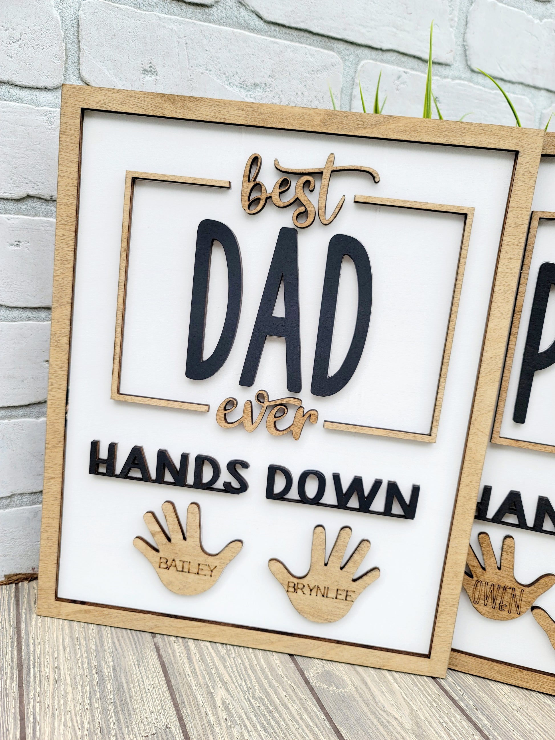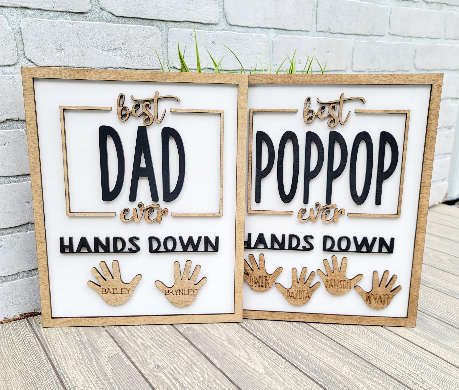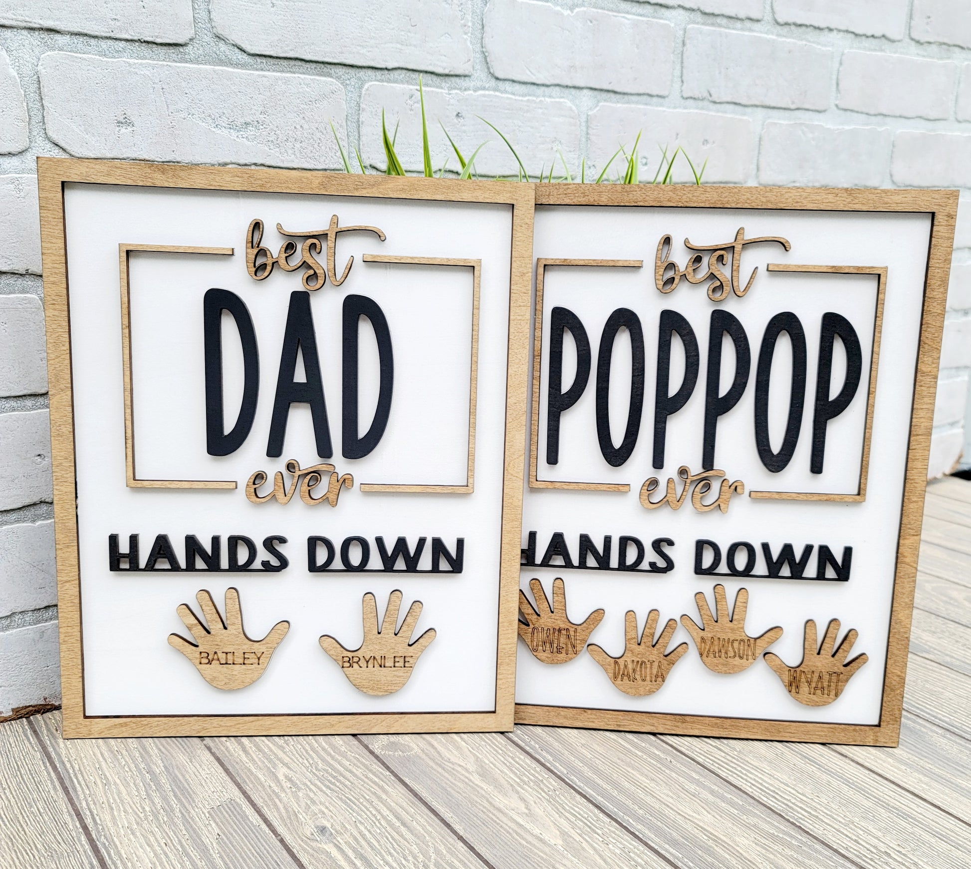 Looking for a fun option for Dad or Grandpa? This sign measures 13.5 x 11 & is customizable with grandkids or kid's names on each hand. Name in center can also be customizable as well. Can customize up to 8 total hands. (Please check spelling!) It does come ready to hang or you can prop up on shelf.