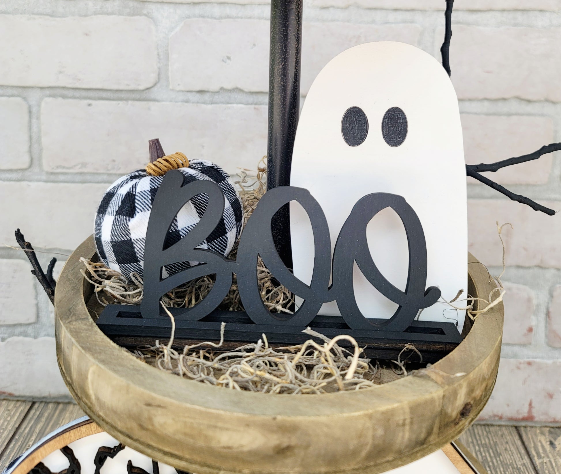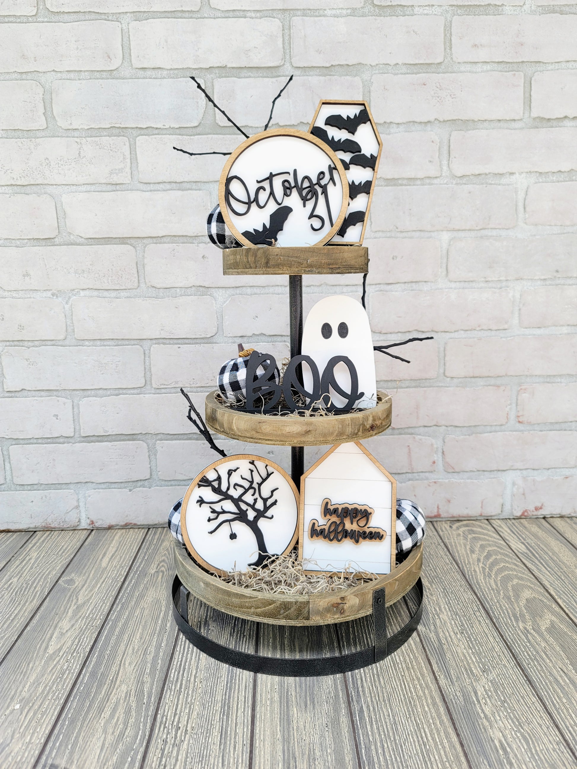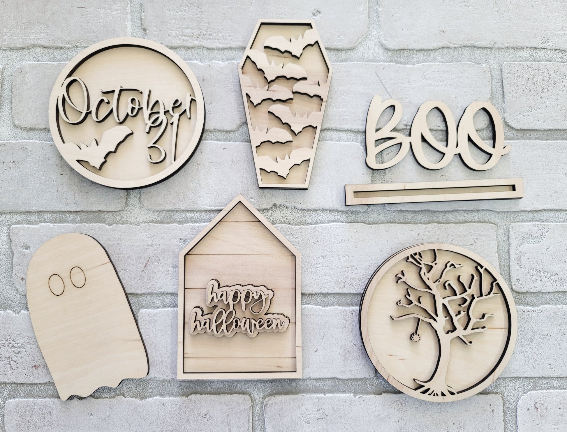 Having a Halloween party?! This would make the perfect Halloween addition to any room! This is a 6-piece set (wood pieces only- no props or tray) and is made with 1/4" wood. Each piece has different 3D elements. This is offered as a painted set or a blank set if you're feeling crafty or you're wanting to plan a girl's night!