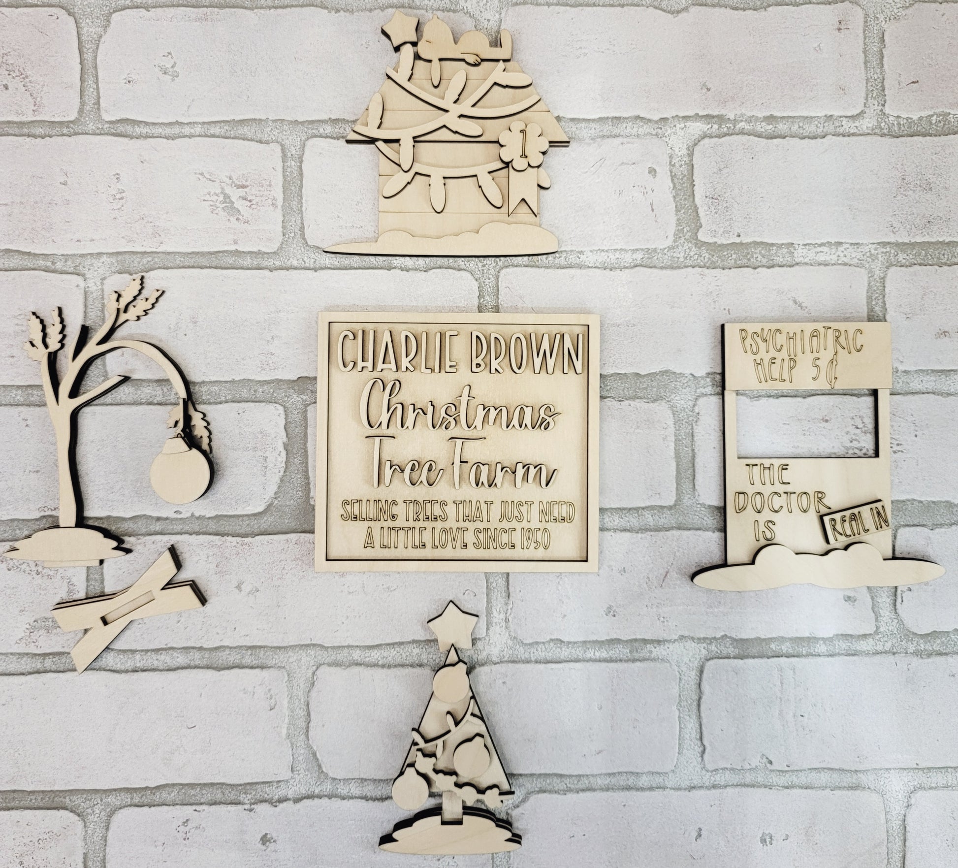 Love Charlie Brown & Snoopy?! This would make the perfect Christmas addition to any room! This is a 5 piece set (wood pieces only- no props or tray) and is made with 1/4" wood. Each piece has different 3D elements. This is offered as a painted set or a blank set (blank set is all wood pieces ONLY) if your feeling crafty or you're wanting to plan a kids night!