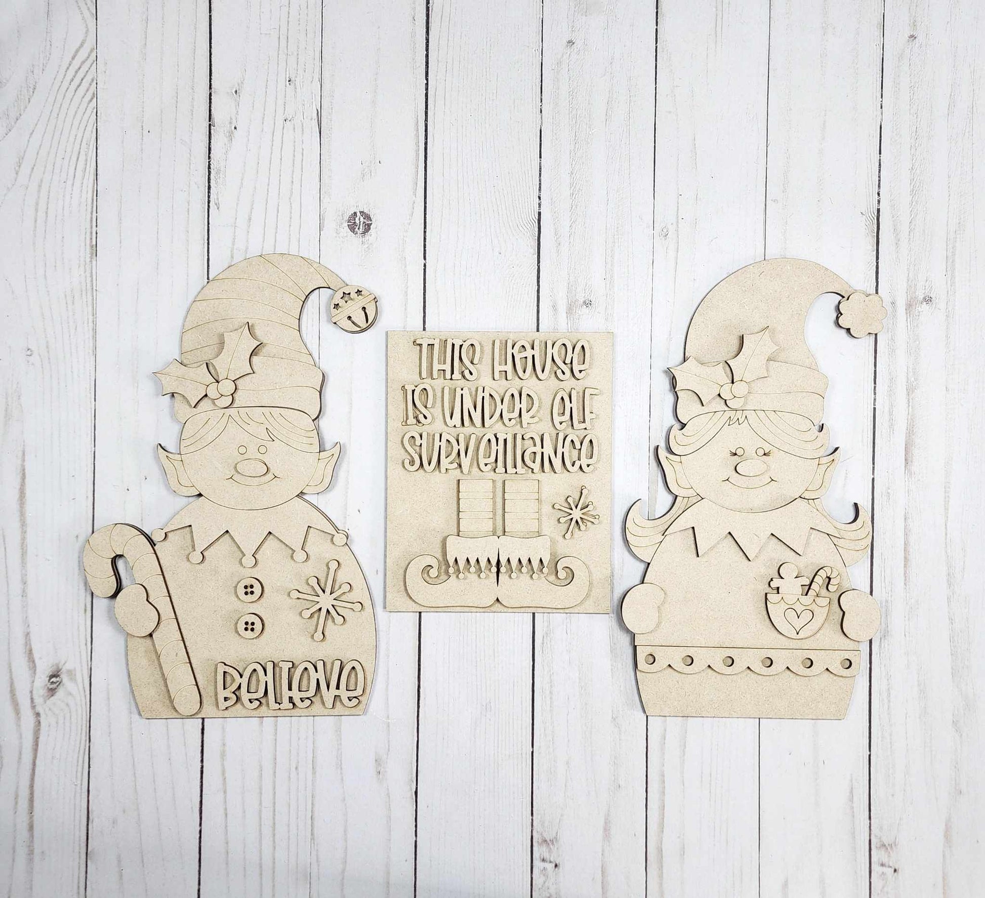 This house is under elf surveillance! This is a fun Christmas add to any room especially if you have kids or grandkids! This is a 3-piece set (Boy Elf, Sign & Girl Elf) Each Elf come with a stand to prop up each elf and the sign comes with an easel. This is available as a painted option OR a DIY blank option for you to paint however you would like! (Blank is wood pieces only)