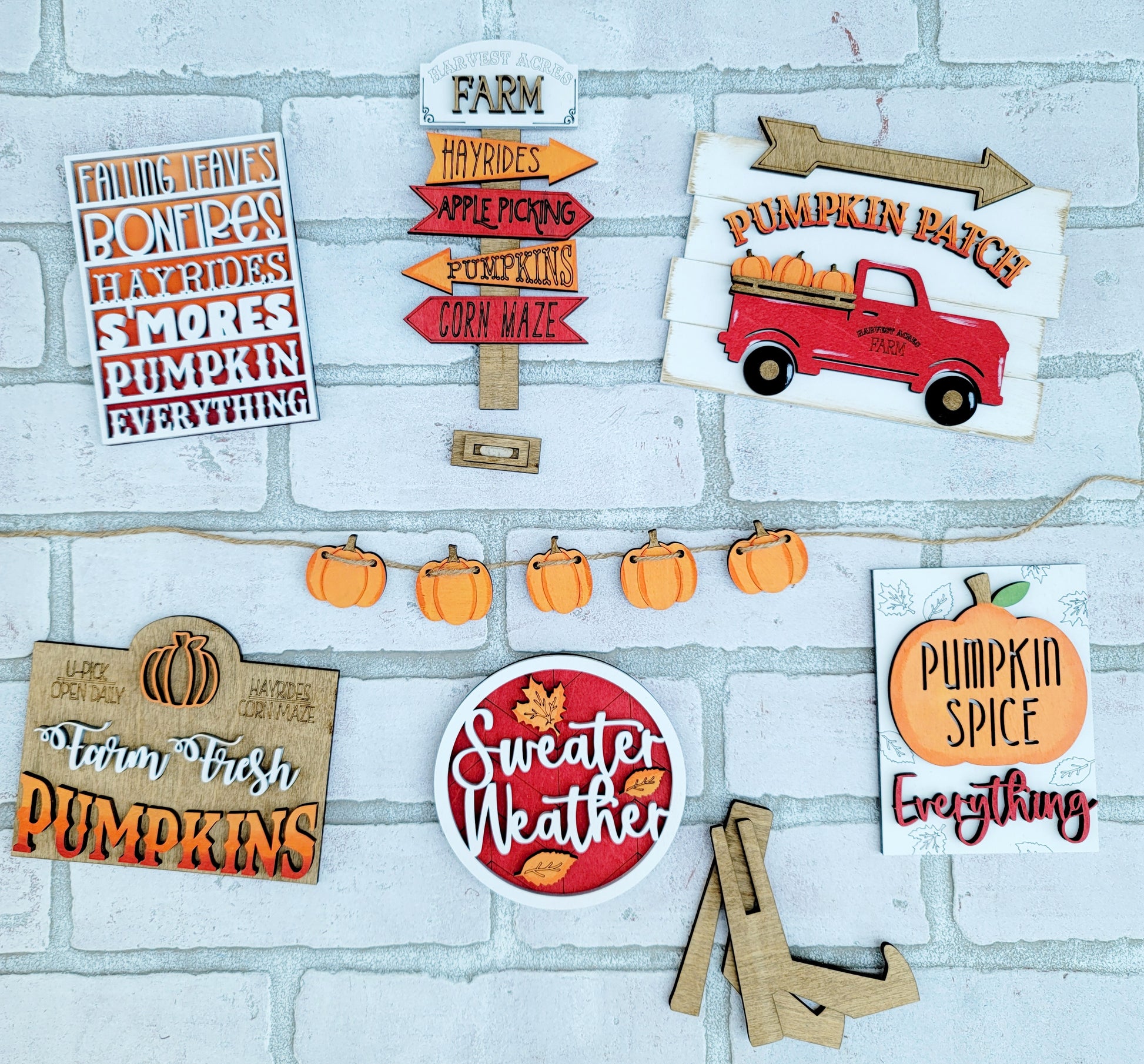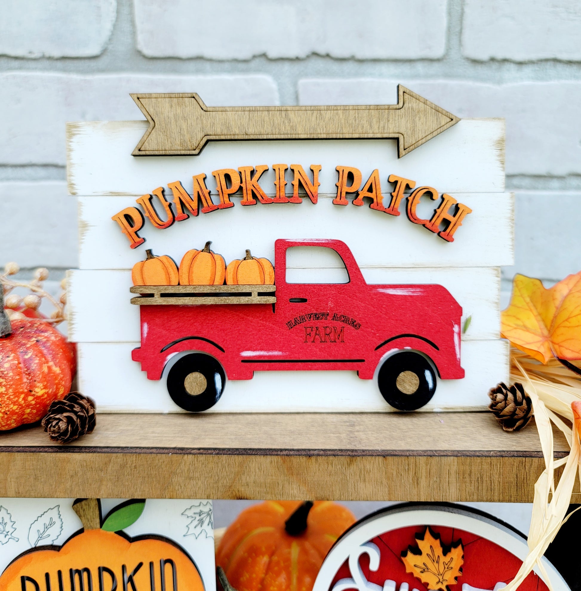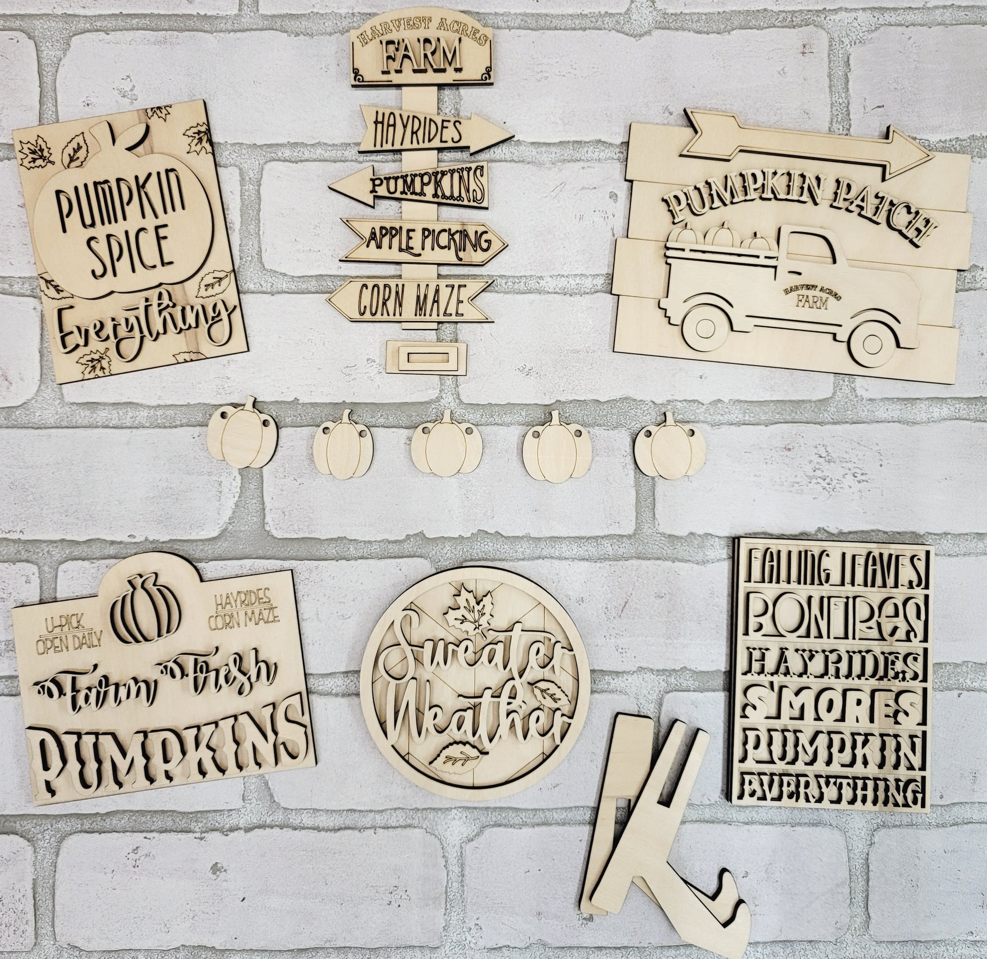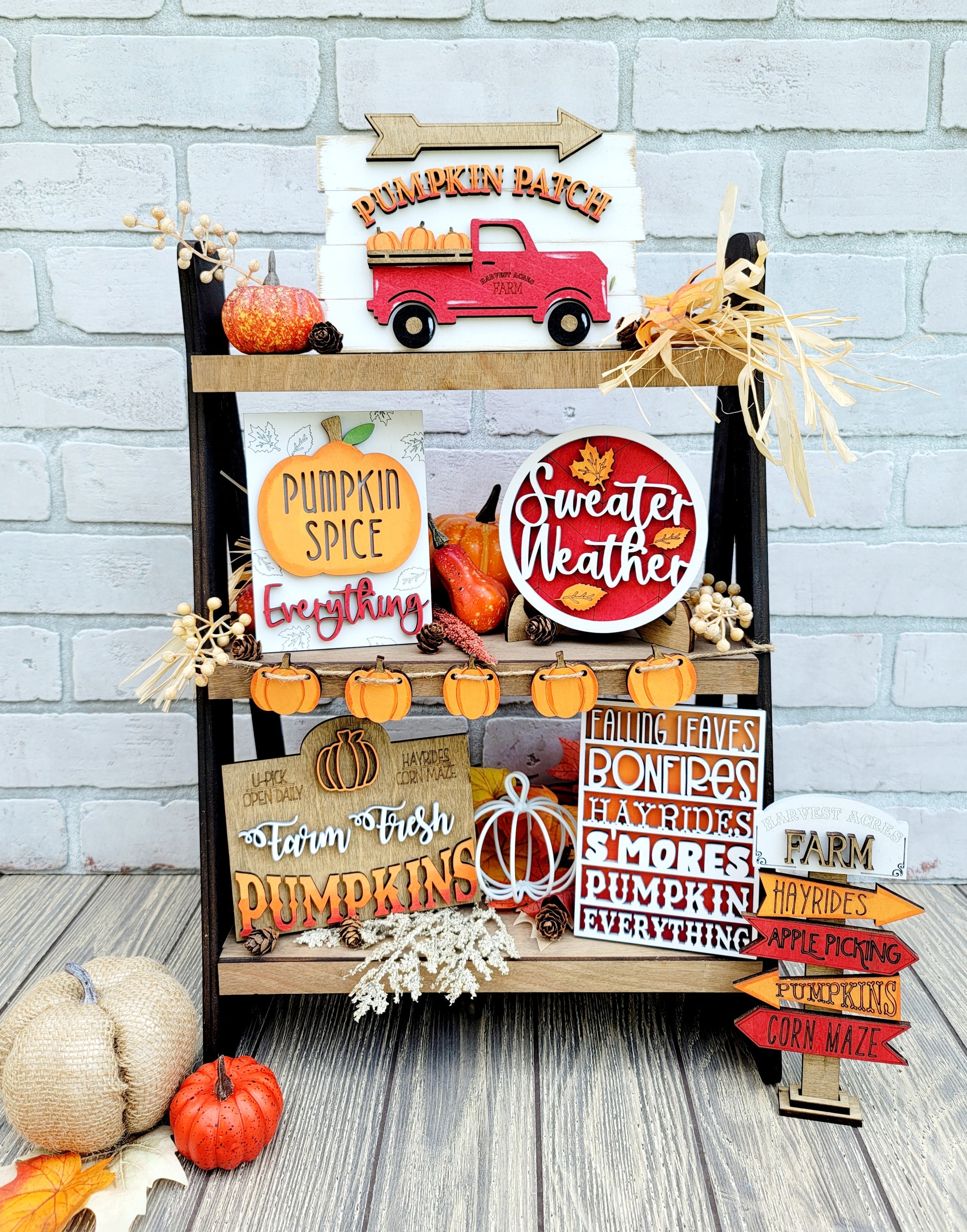 How adorable is this fall tiered tray set?! This would make the perfect fall addition to any room! This is a 8 piece set (wood pieces only- no props or tray) and is made with 1/4" wood. Each piece has different 3D elements. This is offered as a painted set or a blank set if your feeling crafty or your wanting to plan a girls night! Quantity is limited so don't miss out on this adorable tiered tray set!