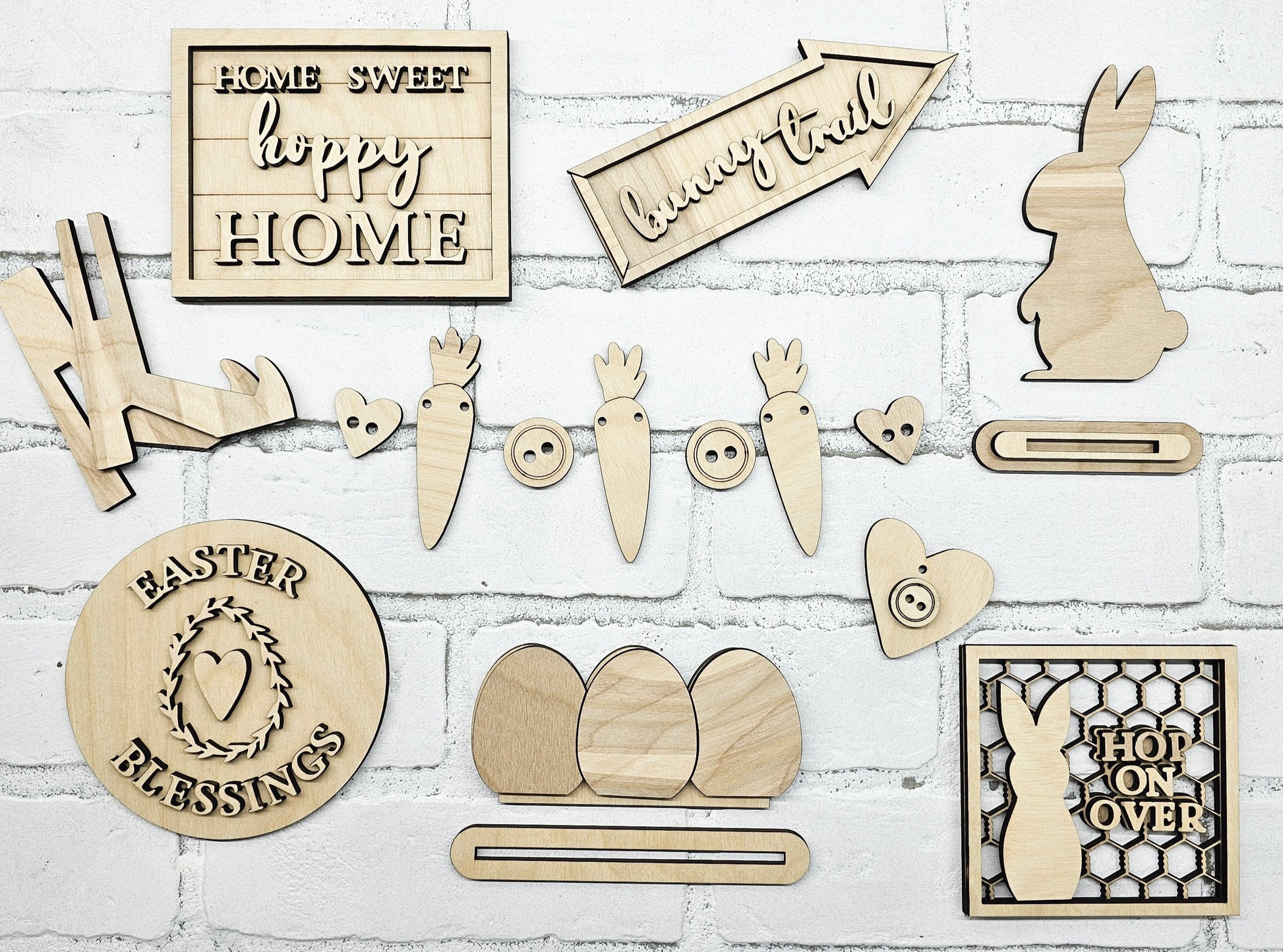 How adorable is this Easter tiered tray set?! This would make the perfect Easter addition to any room! This is a 8-piece set (wood pieces only- no props or tray) and is made with 1/4" wood. Each piece has different 3D elements. This is offered as a painted set or a blank set if you're feeling crafty or you're wanting to plan a girl's night!