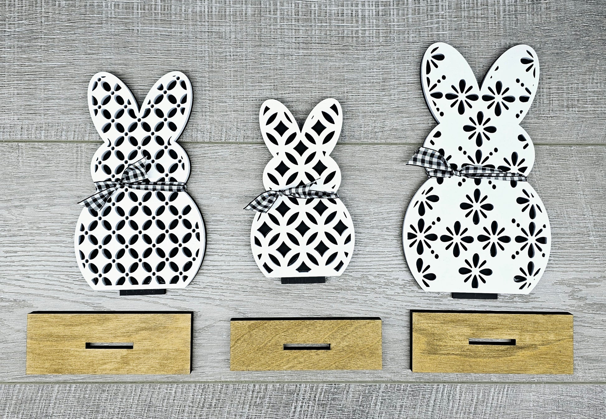 Perfect Easter addition to any shelf or mantle! These bunnies measure from 5 to 7 inches tall. These come painted or as a Blank DIY set (wood pieces only)