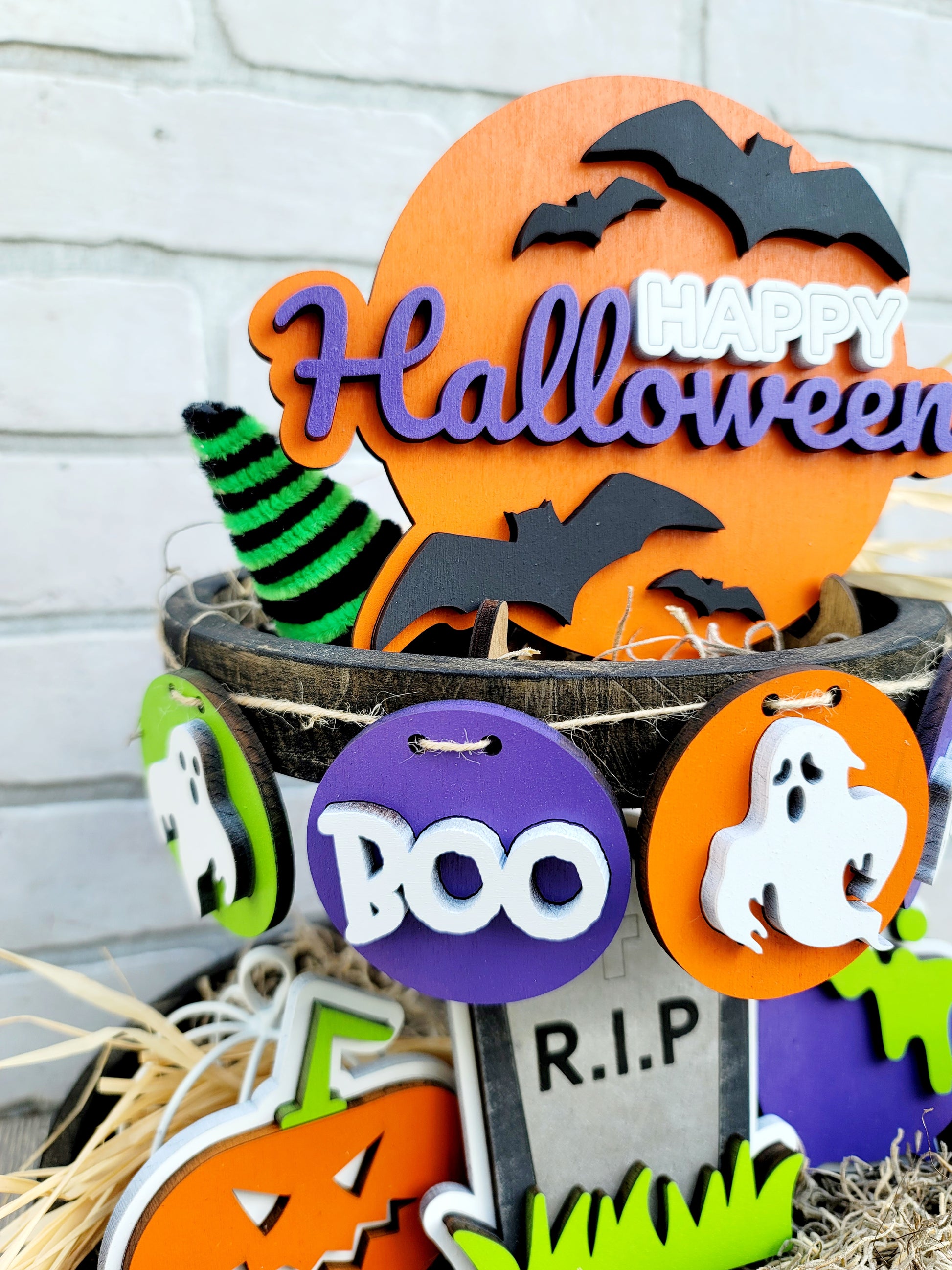 Having a Halloween party?! This would make the perfect Halloween addition to any room! This is a 7-piece set (wood pieces only- no props or tray) and is made with 1/4" wood. Each piece has different 3D elements. This is offered as a painted set or a blank set if you're feeling crafty or you're wanting to plan a girl's night!