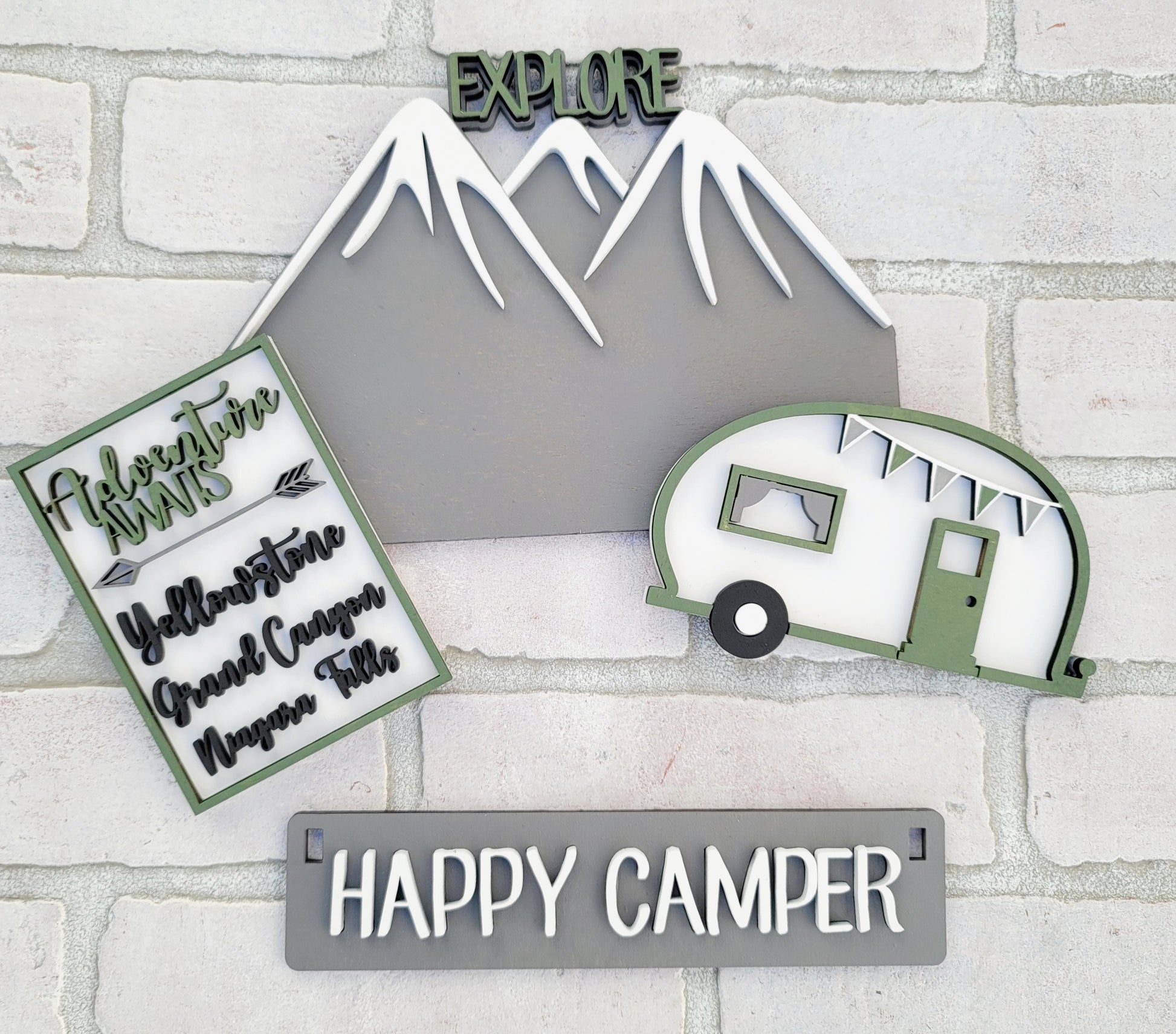 How cute is this set? Perfect addition for your interchangeable crate/shelf sitter if you're a camping lover! This set includes 4 pieces and the hooks to hang the happy camper sign. These are offered painted or as a DIY Blank option for you to paint however you would like. This listing is for the inserts only. Crate/Shelf Sitter sold separately.