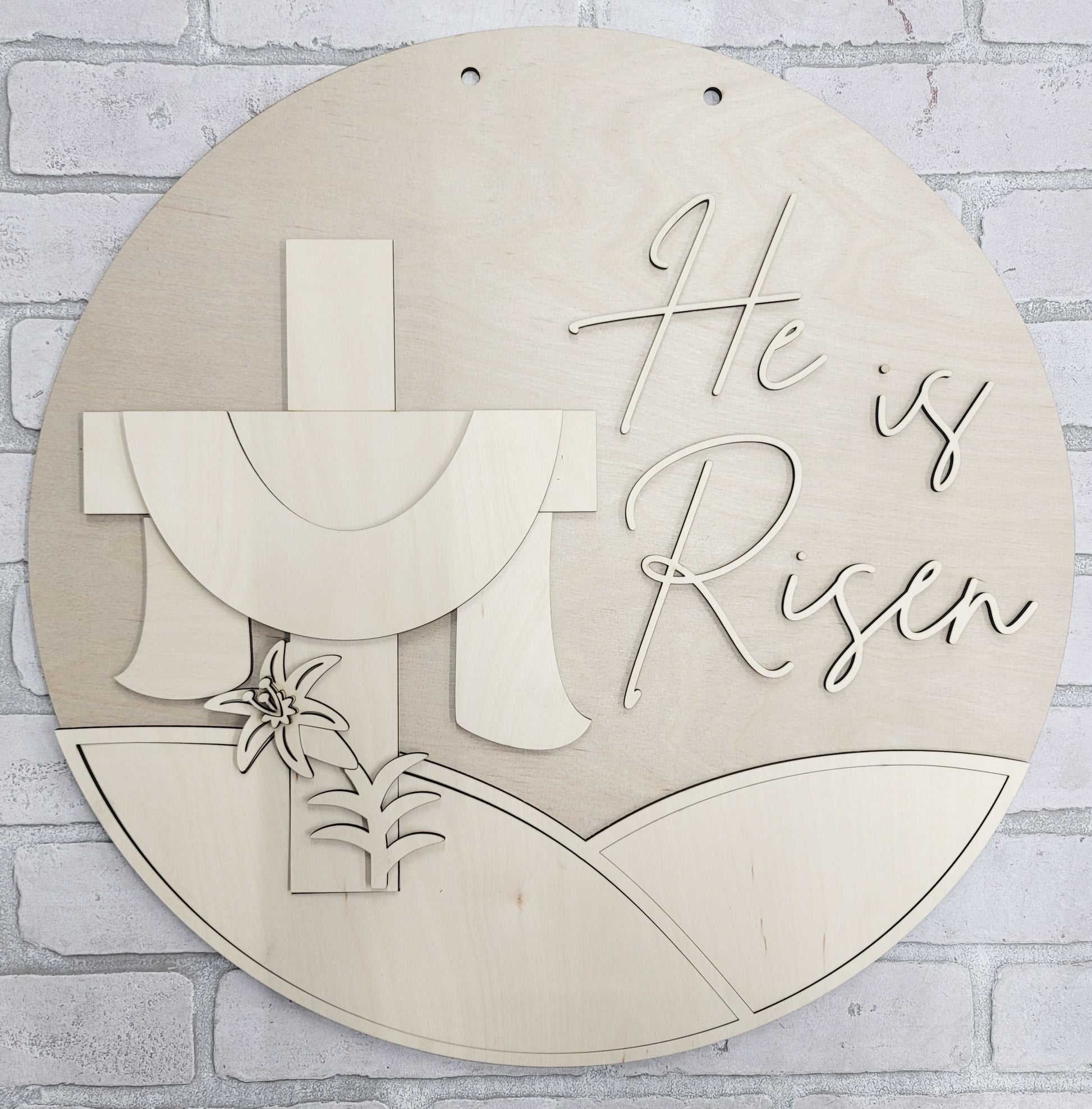He is Risen! Perfect addition to that front door for Easter! This door hanger is 22" tall and is made with 1/4" wood. It also has 3d pieces including the wording & the decorative pieces. There is also an option to buy blank to get crafty or even host you own paint party with friends and family. (Blank option does not come with bow materials, just blank wood pieces)