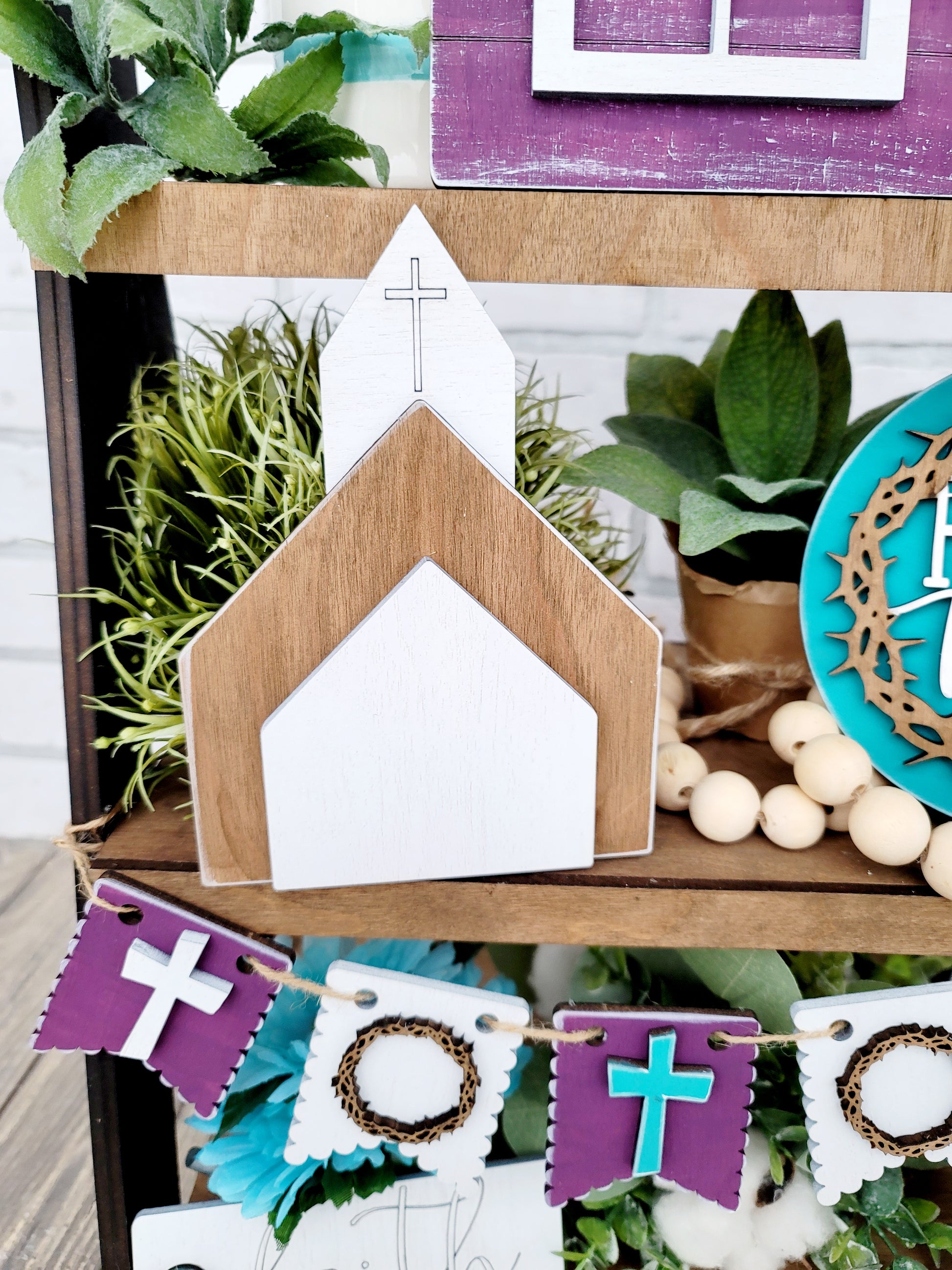 How adorable is this Faith based Easter tiered tray set?! This would make the perfect Easter or all year round addition to any room! This is a 6 piece set (wood pieces only- no props or tray) and is made with 1/4" wood. Each piece has different 3D elements. This is offered as a painted set or a blank set (wood pieces only) if your feeling crafty or your wanting to plan a girls night! Quantity is limited so don't miss out on this adorable tiered tray set!