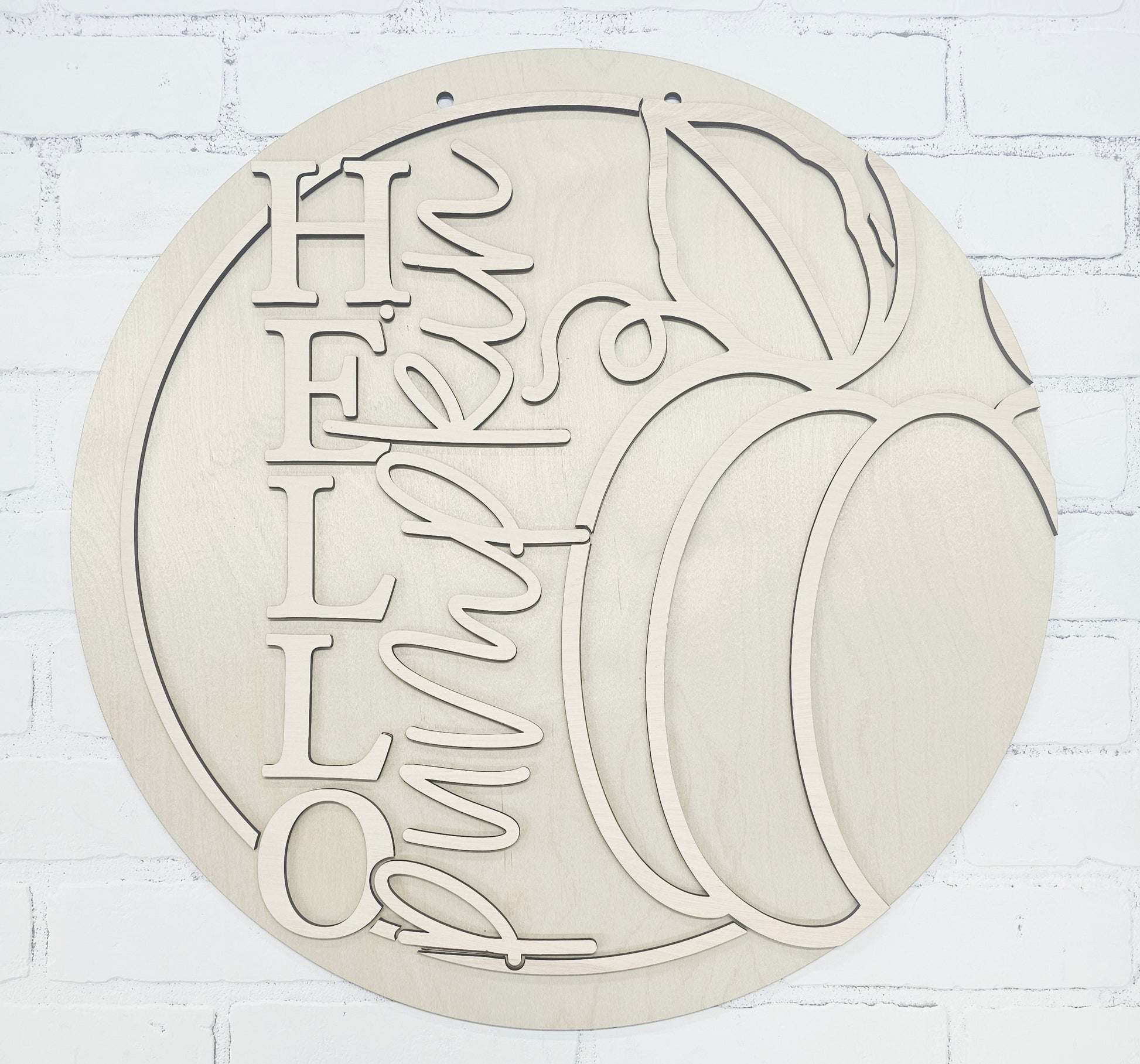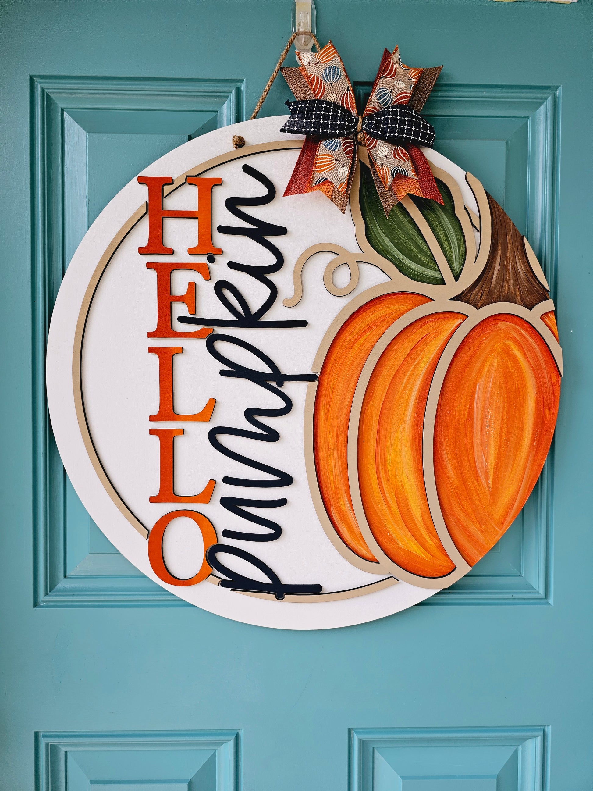How adorable is this fall door hanger?! This door hanger is 22" tall and is made with 1/4" wood. This hanger also includes the multicolored bow that is pictured if you buy completed. There is also an option to buy blank to get crafty or even host you own paint party with friends and family. (Blank option does not come with bow materials, just blank wood pieces)