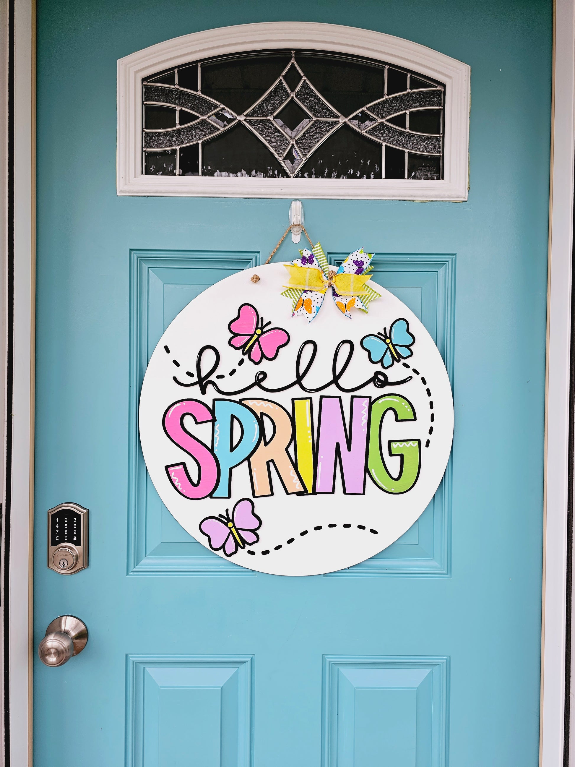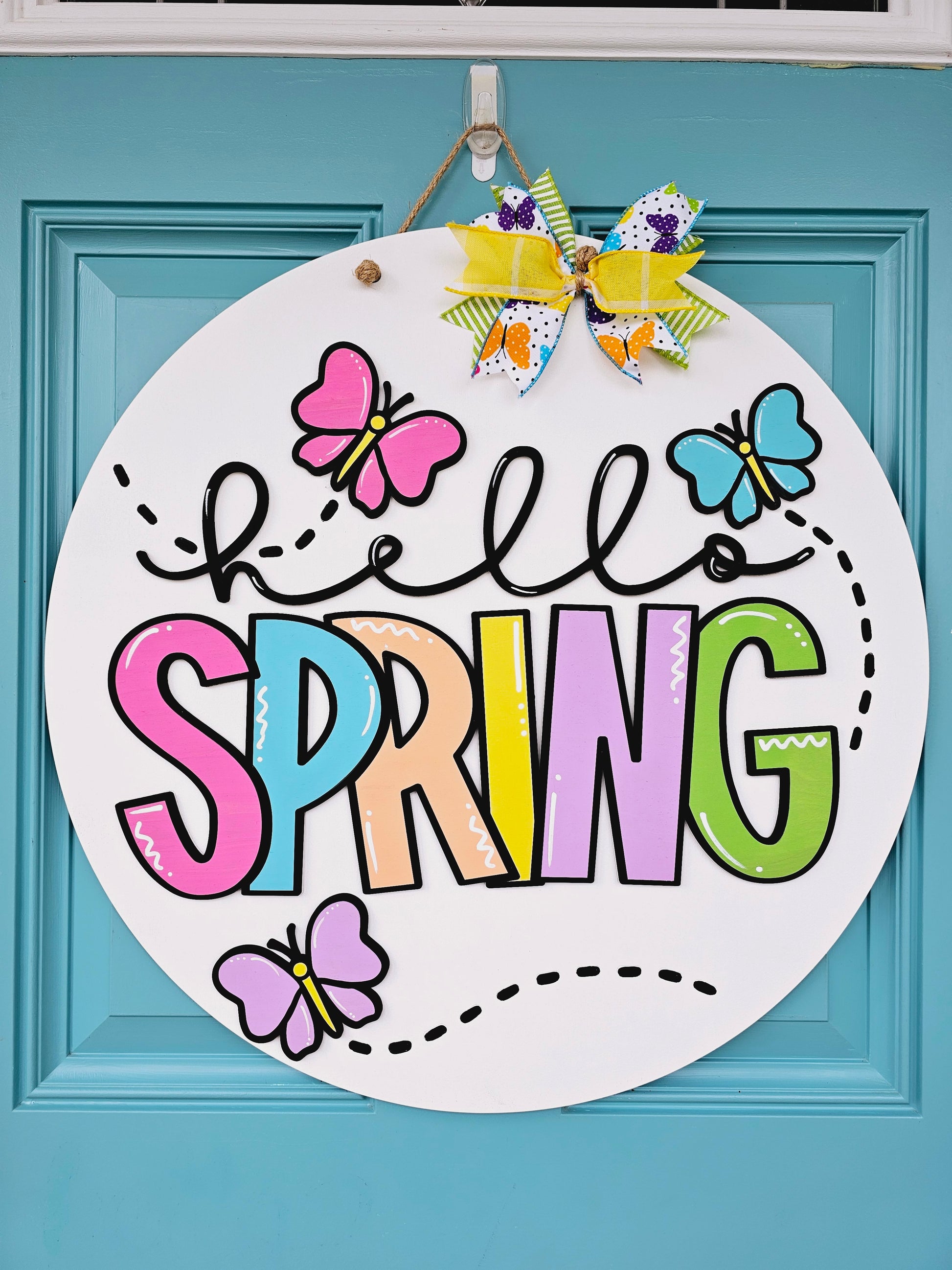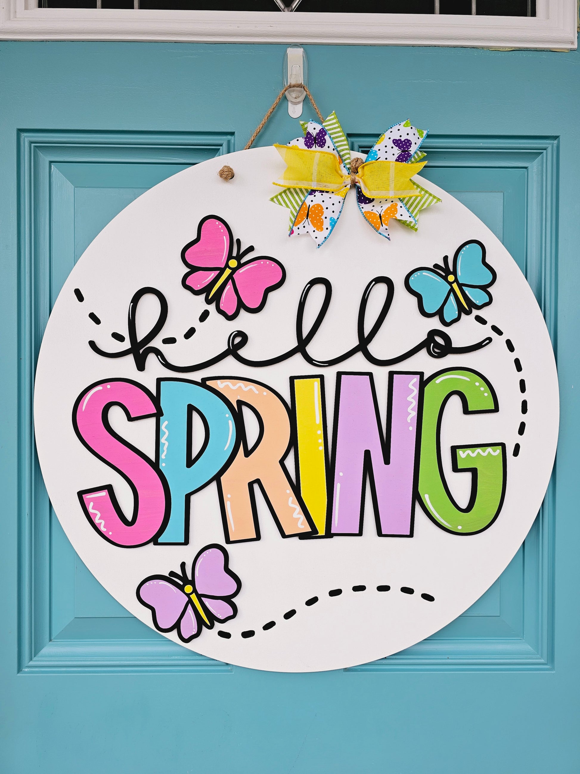 How cute is this spring door hanger?! This door hanger is 22" tall and is made with 1/4" wood. This hanger also includes the multicolored bow that is pictured if you buy completed. There is also an option to buy blank to get crafty or even host you own paint party with friends and family. (Blank option does not come with bow materials, just blank wood pieces)