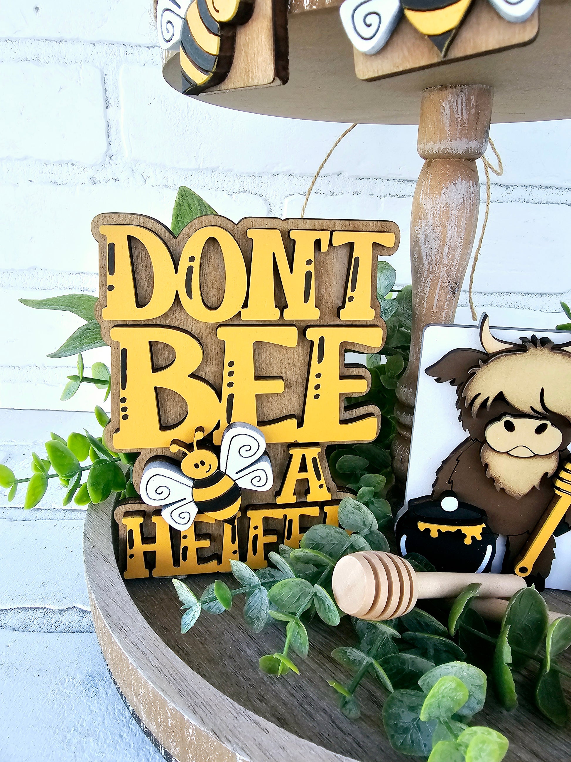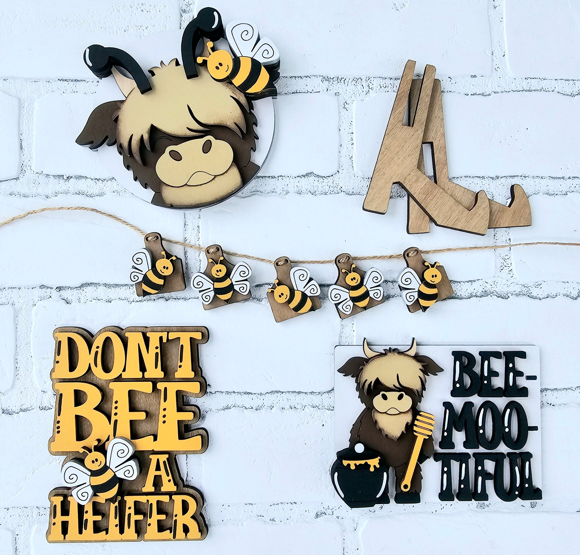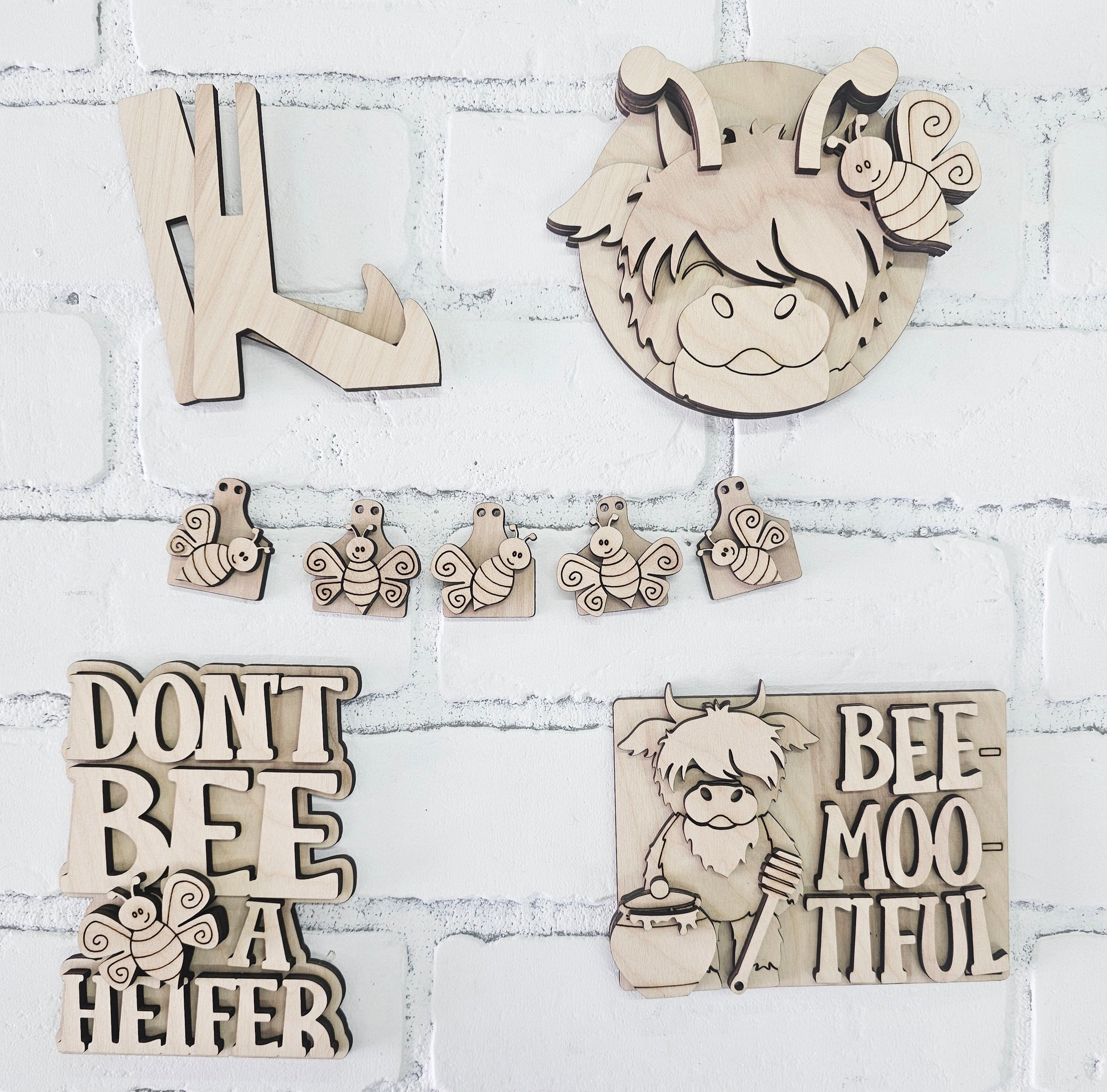 How adorable is this Highland Cow Bee tiered tray set?! This would make the perfect Spring or all year-round addition to any room! This is a 5-piece set (wood pieces only- no props or tray) and is made with 1/4" wood. Each piece has different 3D elements. This is offered as a painted set or a blank set if you're feeling crafty or you're wanting to plan a girl's night!