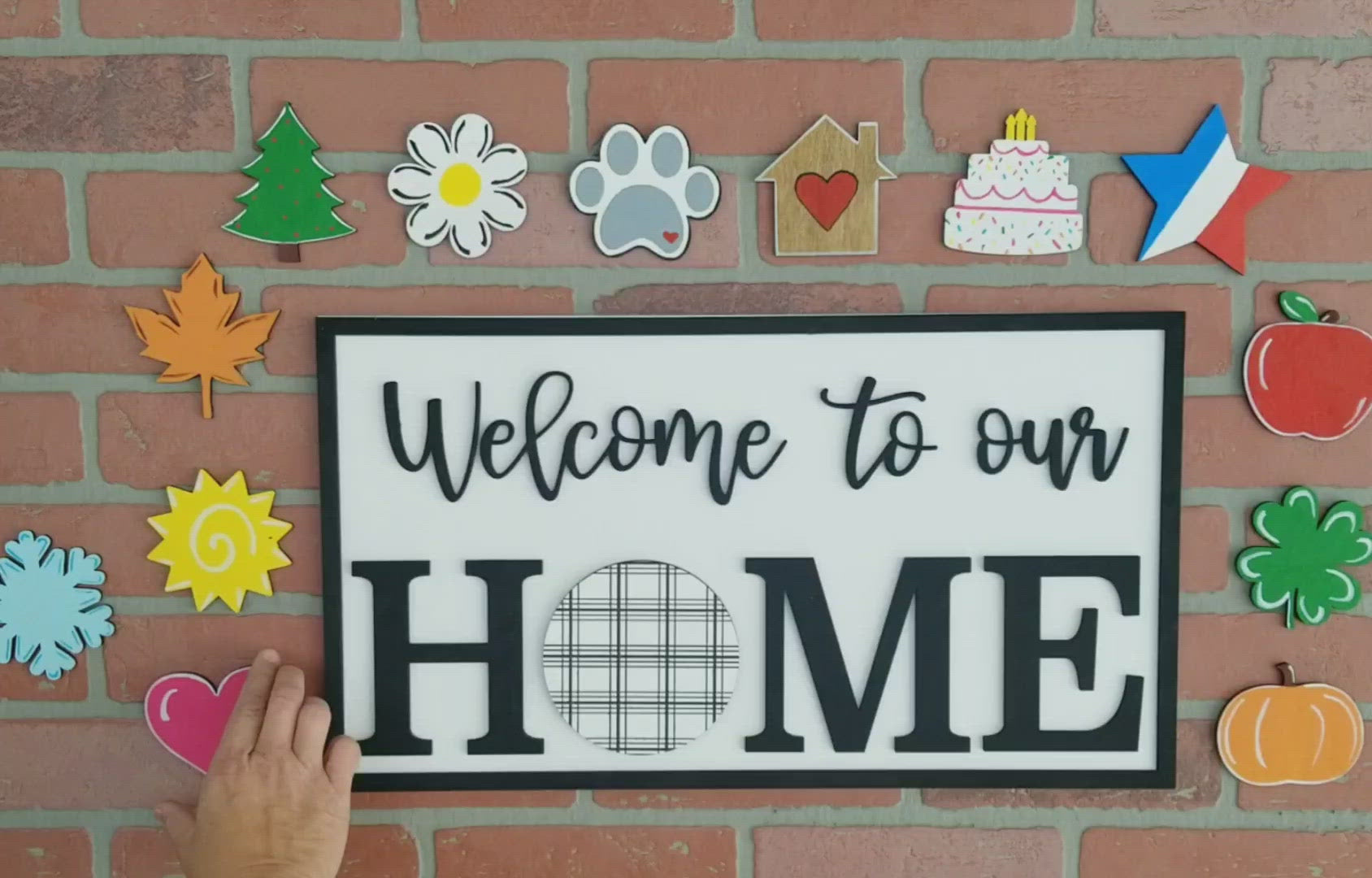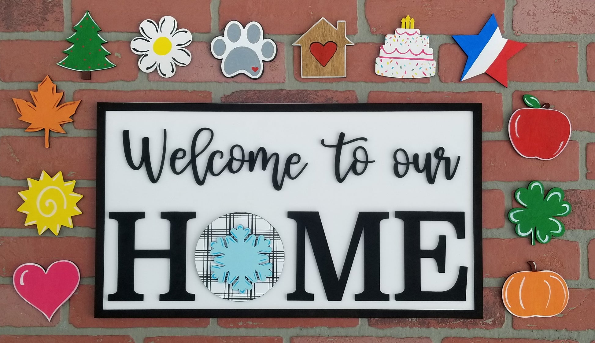 How fun is this sign? This sign come with 13- 4" interchangeable parts. The overall sign measures 21x12 and you can choose whether it says "Welcome to our Home" or "Home Sweet Home". Great piece for all year round or to give as a gift!