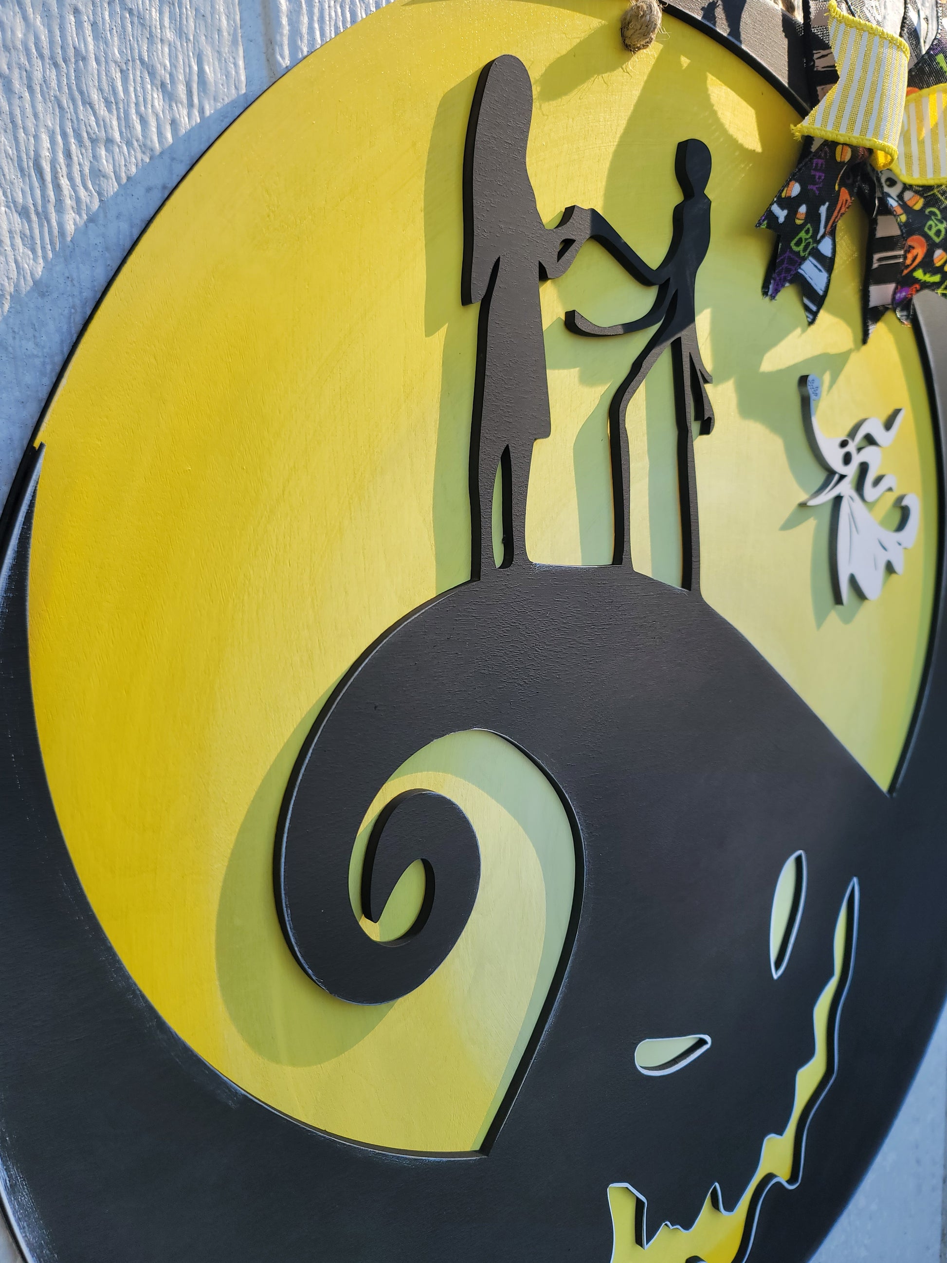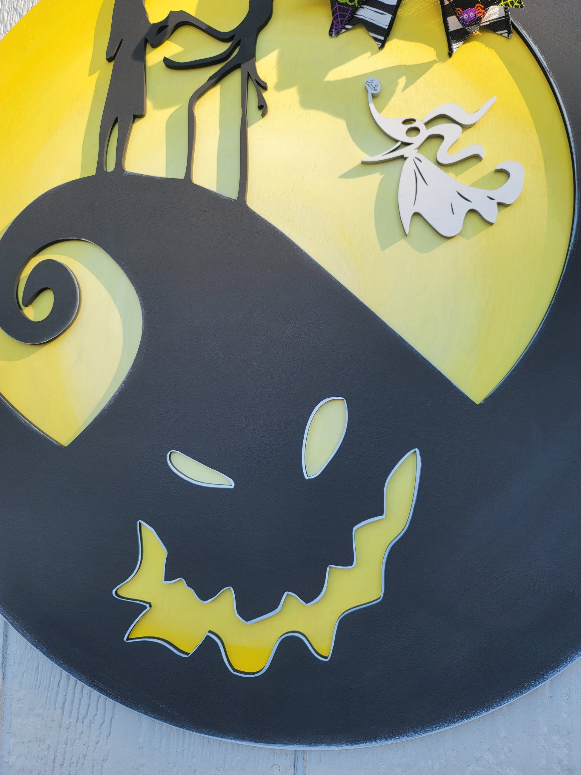 Nightmare before Christmas Fan?! This would make the perfect Halloween addition to any front door! This door hanger is 22" and is made with 1/4" wood. It also has 3d pieces including the wording & the decorative pieces. This hanger also includes the multicolored bow that is pictured if you buy completed. There is also an option to buy blank to get crafty or even host you own paint party with friends and family. (Blank option does not come with bow materials, just blank wood pieces)