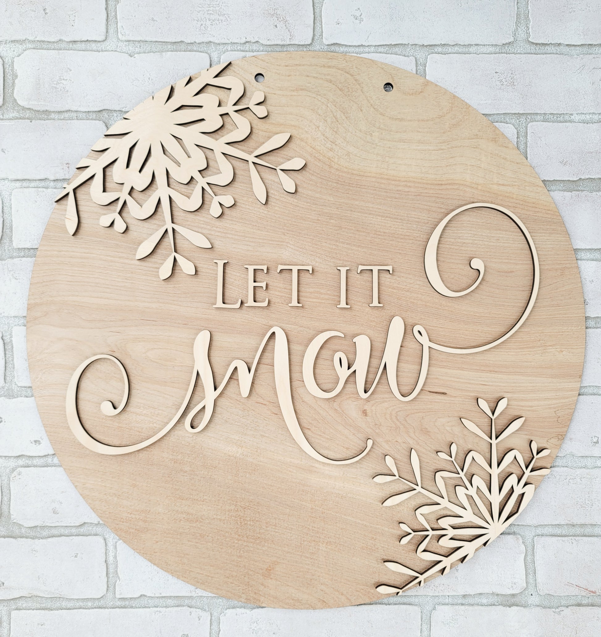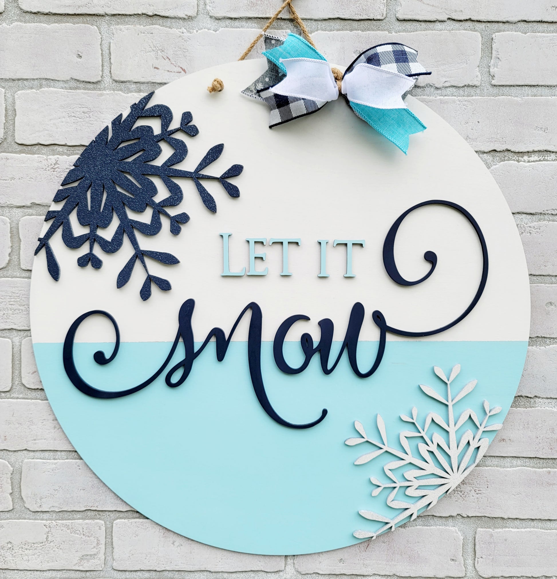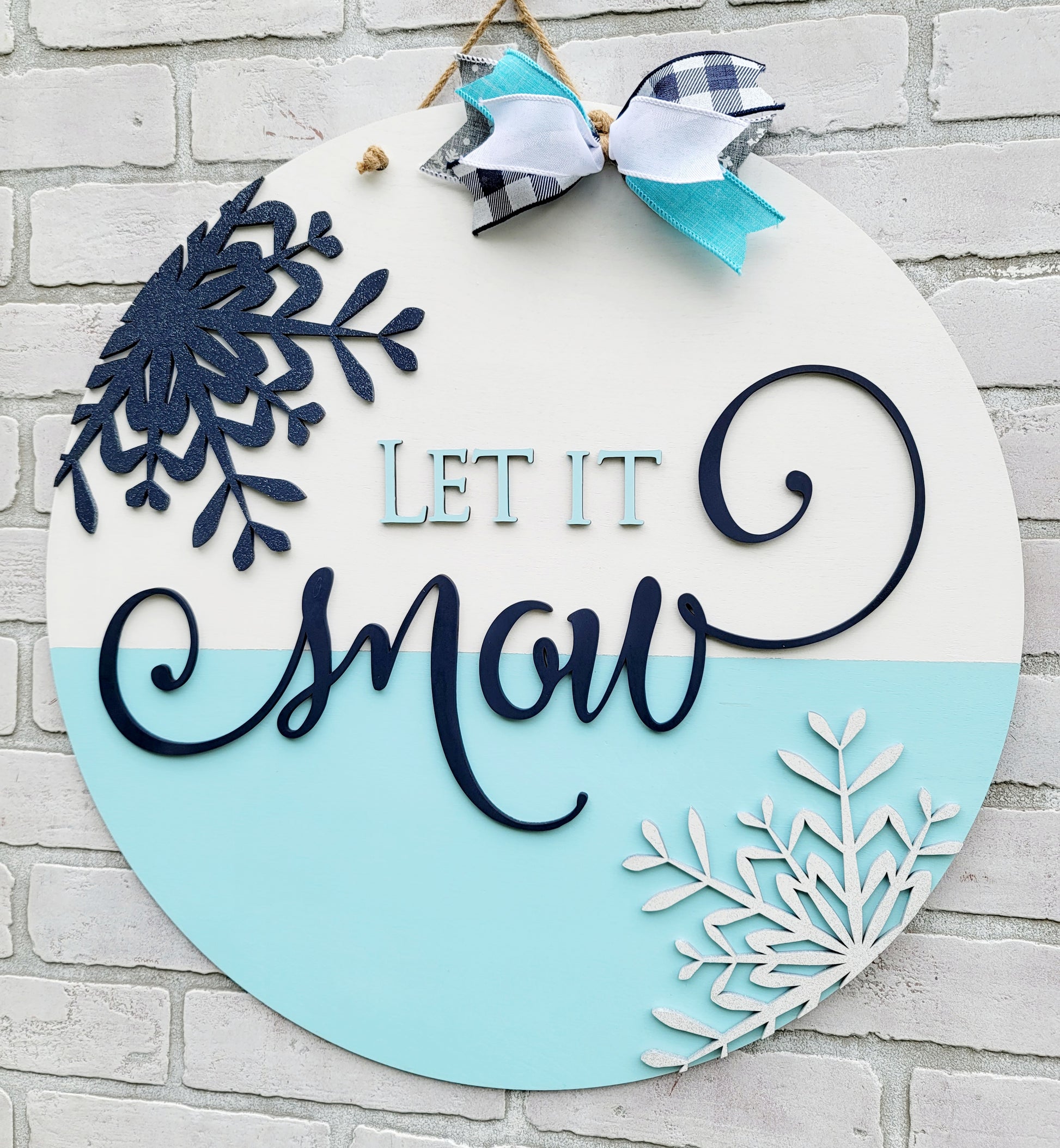 Let it snow! Perfect addition to any front door for the holidays! This door hanger is 22" tall and is made with 1/4" wood. It also has 3d pieces including the wording & the decorative pieces. This hanger also includes the multi colored bow that is pictured if you buy completed. There is also an option to buy blank to get crafty or even host you own paint party with friends and family. (Blank option does not come with bow materials, Just blank wood pieces)