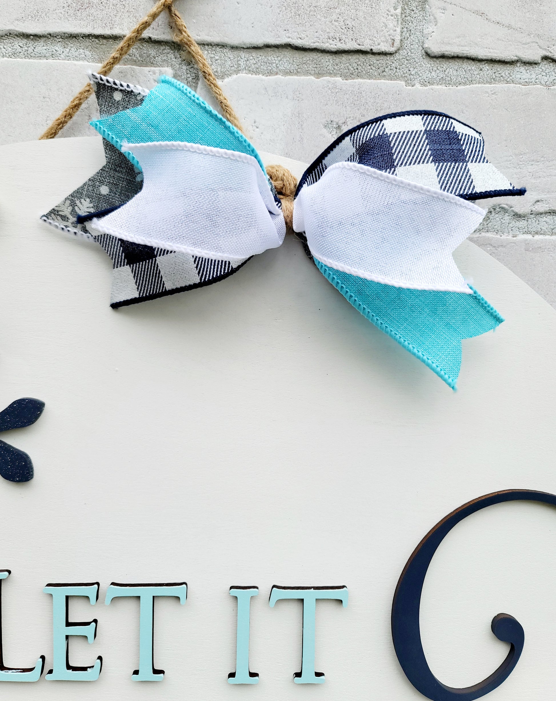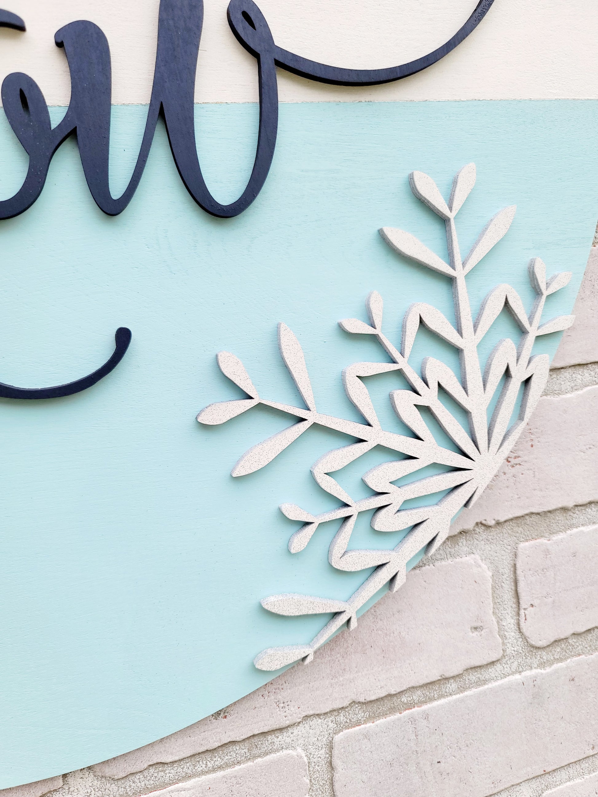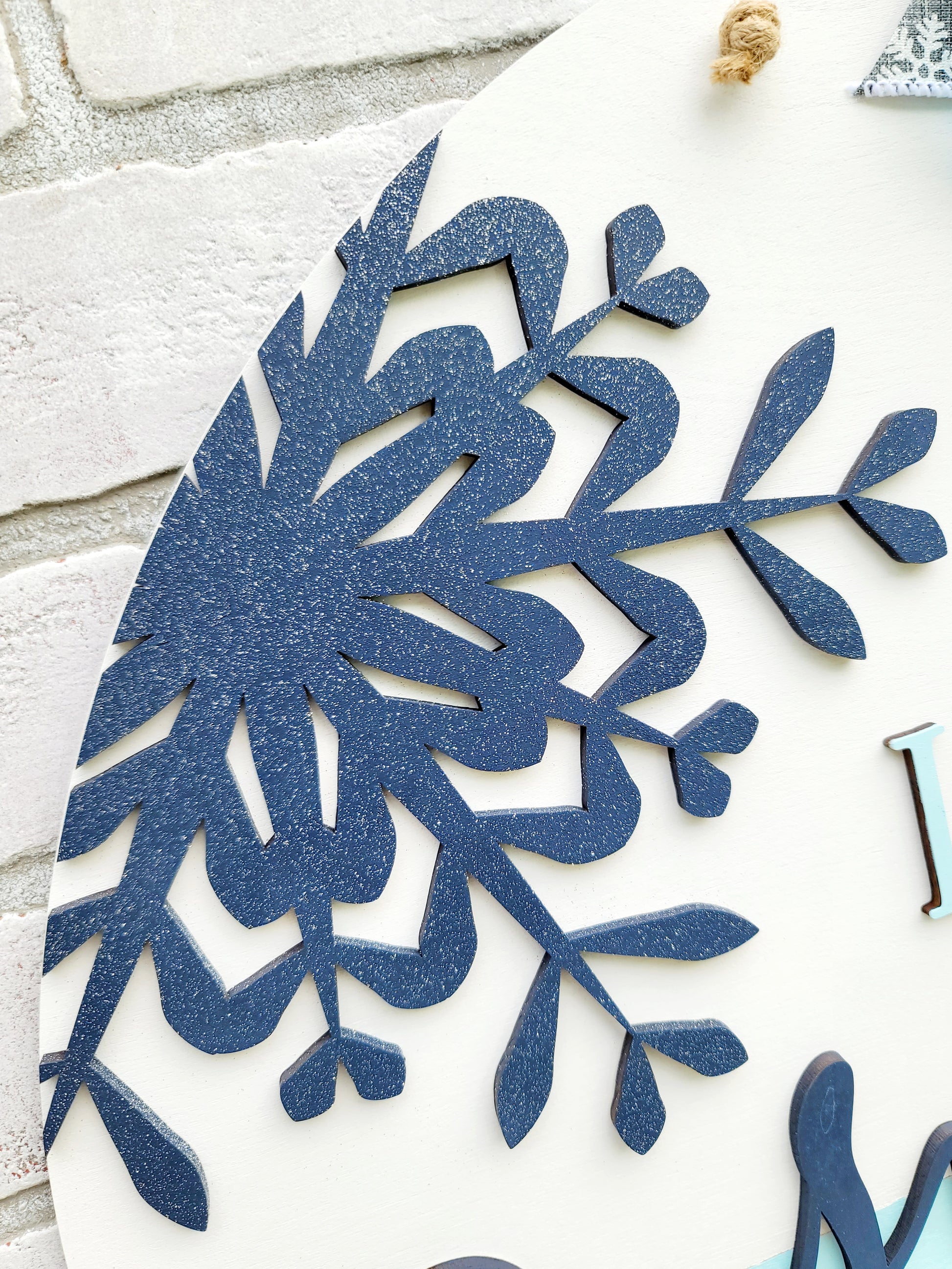 Let it snow! Perfect addition to any front door for the holidays! This door hanger is 22" tall and is made with 1/4" wood. It also has 3d pieces including the wording & the decorative pieces. This hanger also includes the multi colored bow that is pictured if you buy completed. There is also an option to buy blank to get crafty or even host you own paint party with friends and family. (Blank option does not come with bow materials, Just blank wood pieces)