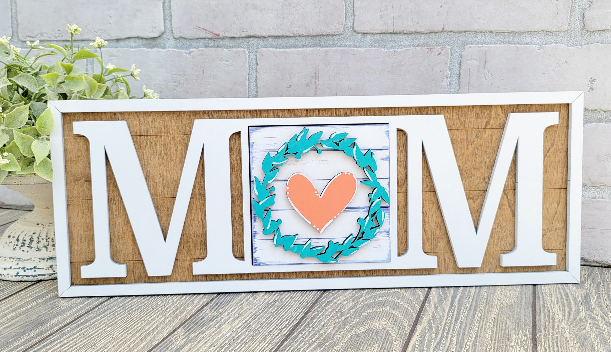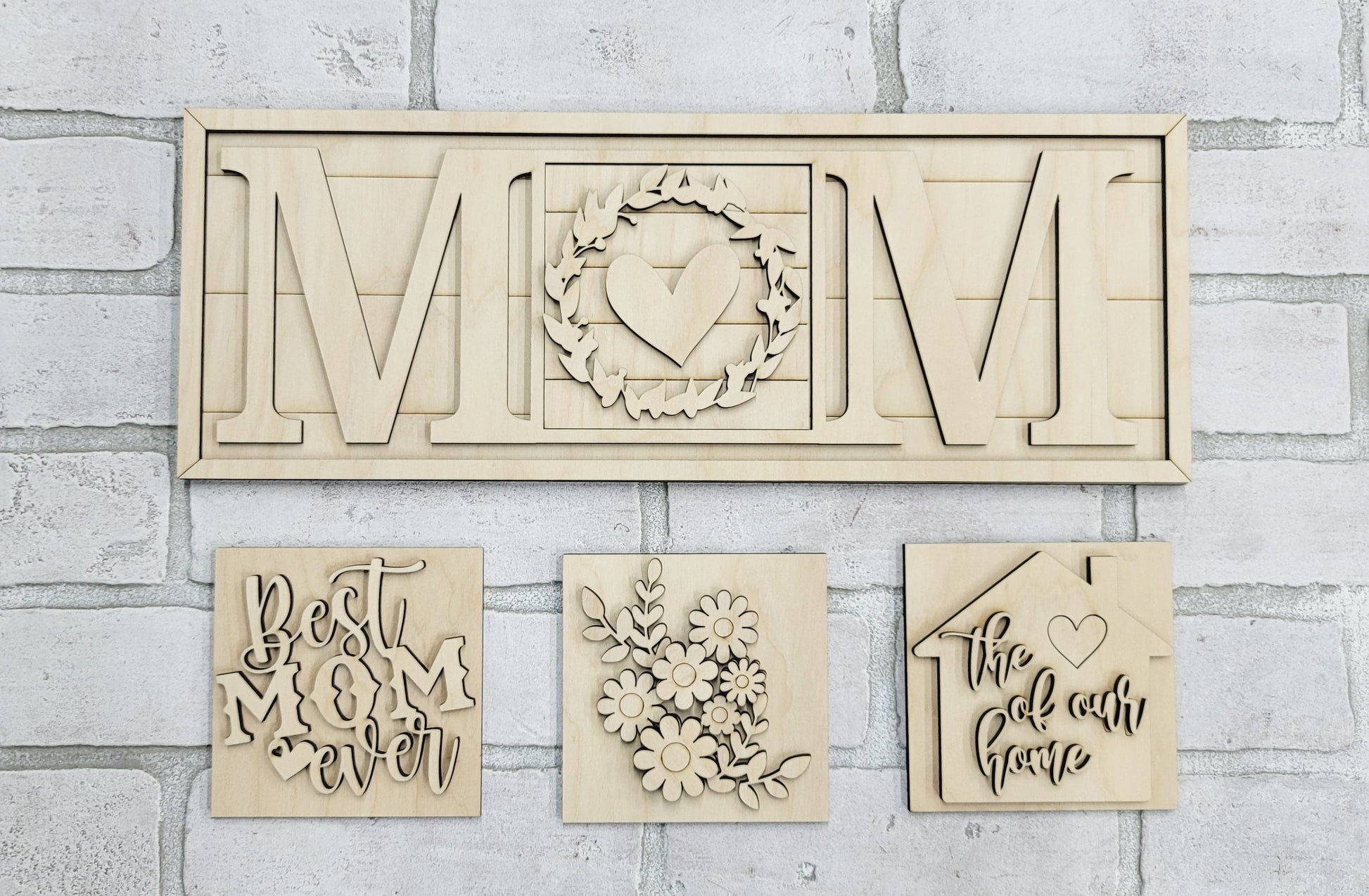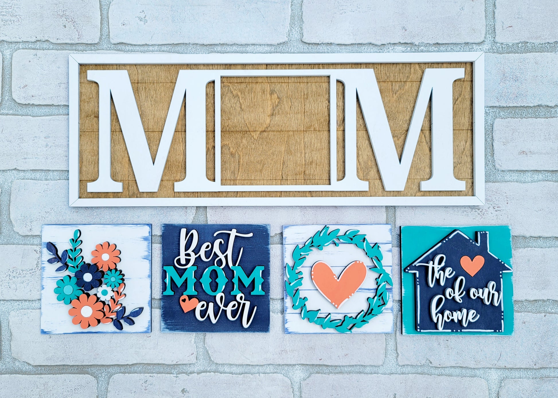 Looking for a unique gift for mom? This is the perfect option to use year-round. This sign measures 17" x 6.5" and comes with 4 interchangeable squares measuring 4.5" each. It also comes with an easel stand if you choose to use. This is also available as a DIY to paint yourself (wood pieces ONLY) Would be a great gift for the kids to paint!
