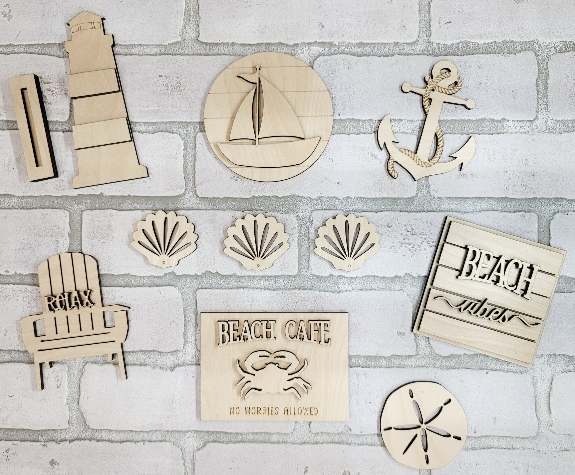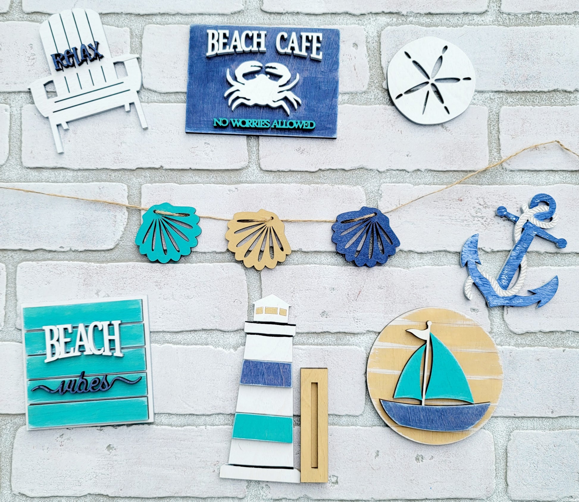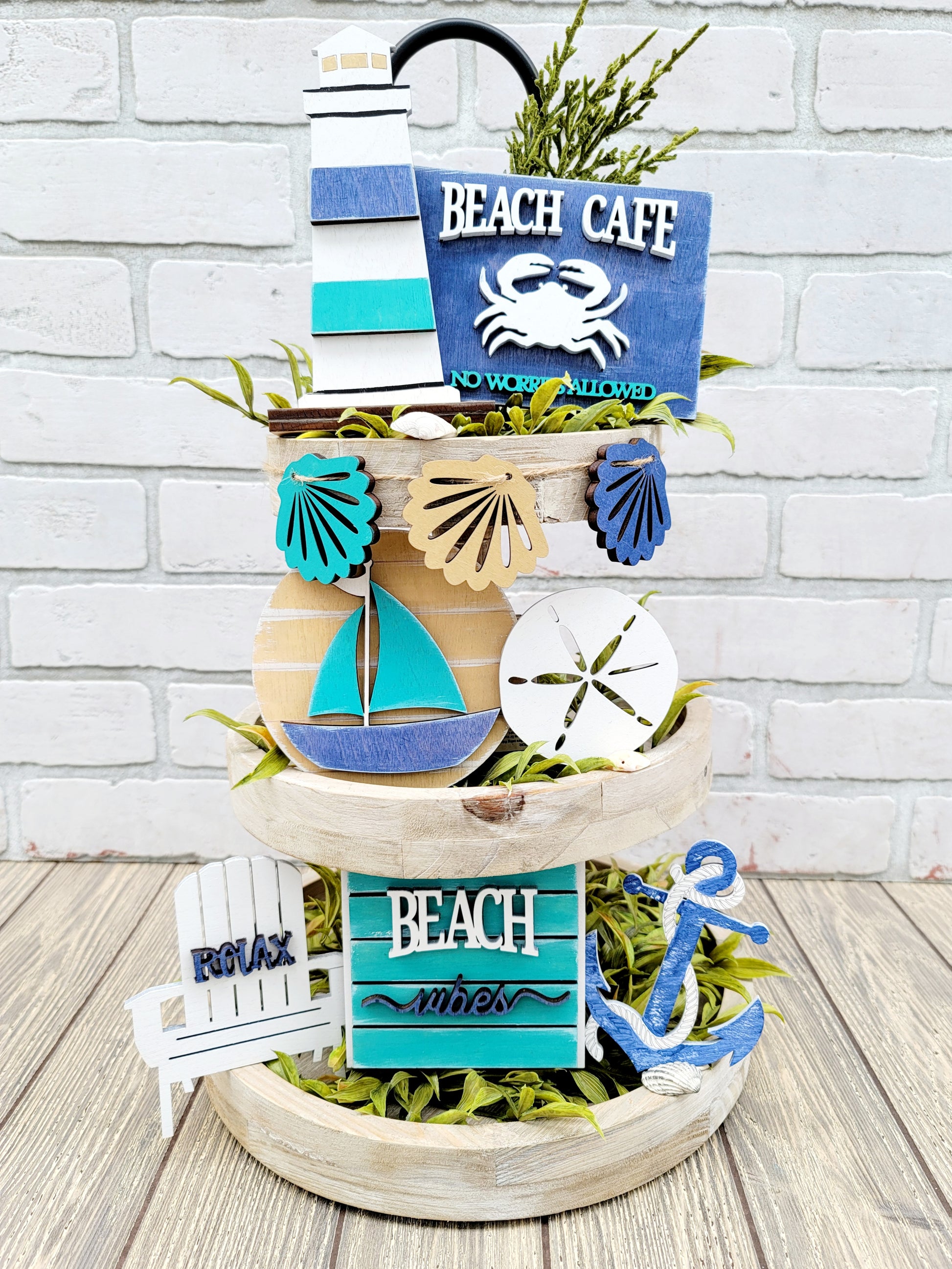 How adorable is this Nautical/Beachy tiered tray set?! This would make the perfect beachy addition to any room! This is a 8 piece set (wood pieces only- no props or tray) and is made with 1/4" wood. Each piece has different 3D elements. This is offered as a painted set or a blank set if your feeling crafty or your wanting to plan a girls night! Quantity is limited so don't miss out on this adorable tiered tray set!