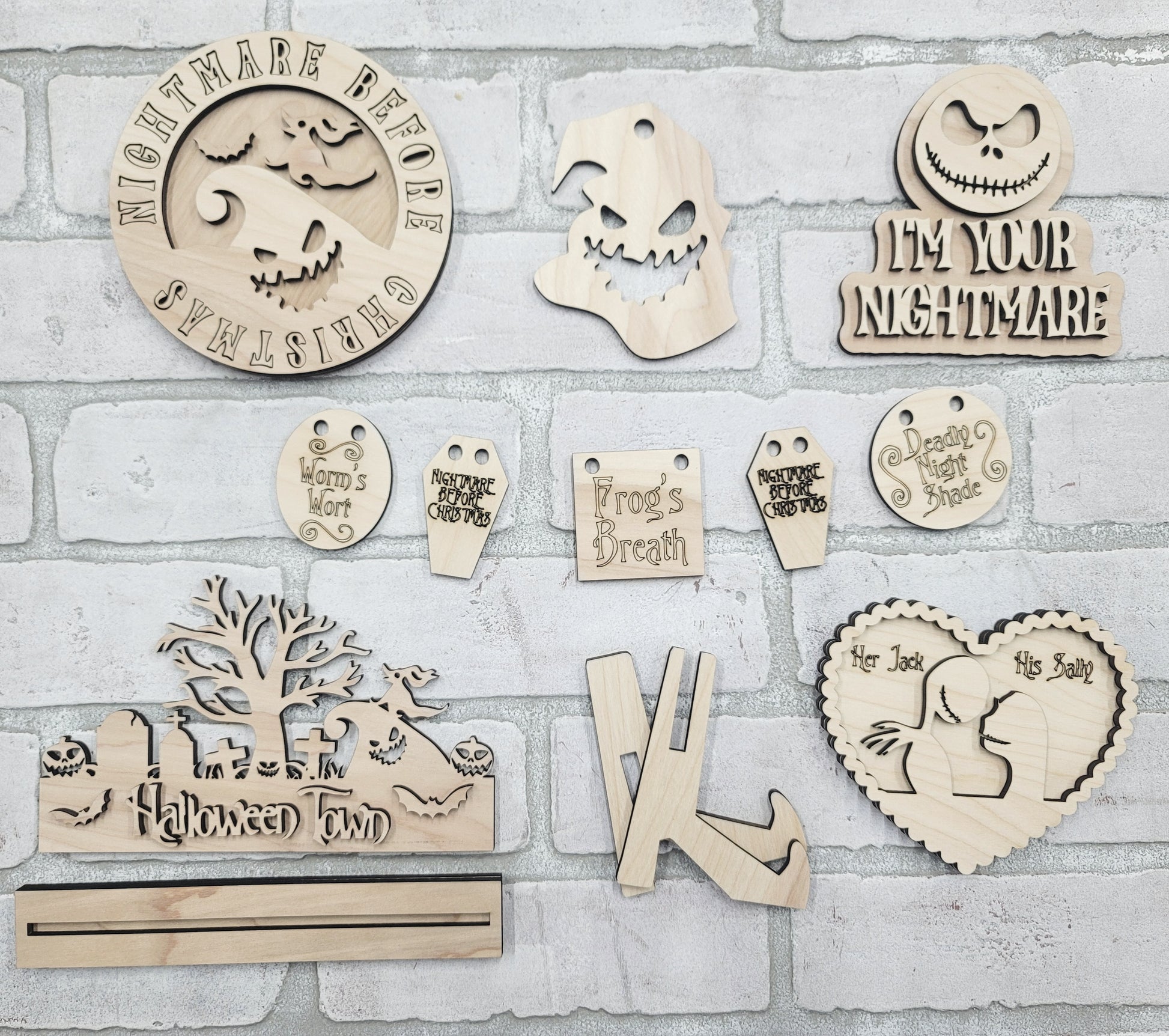 NBC fan?! This would make the perfect Halloween addition to any room! This is a 7 piece set (wood pieces only- no props or tray) and is made with 1/4" wood. Each piece has different 3D elements. This is offered as a painted set or a blank set if your feeling crafty or your wanting to plan a girls night! Quantity is limited so don't miss out on this adorable tiered tray set!