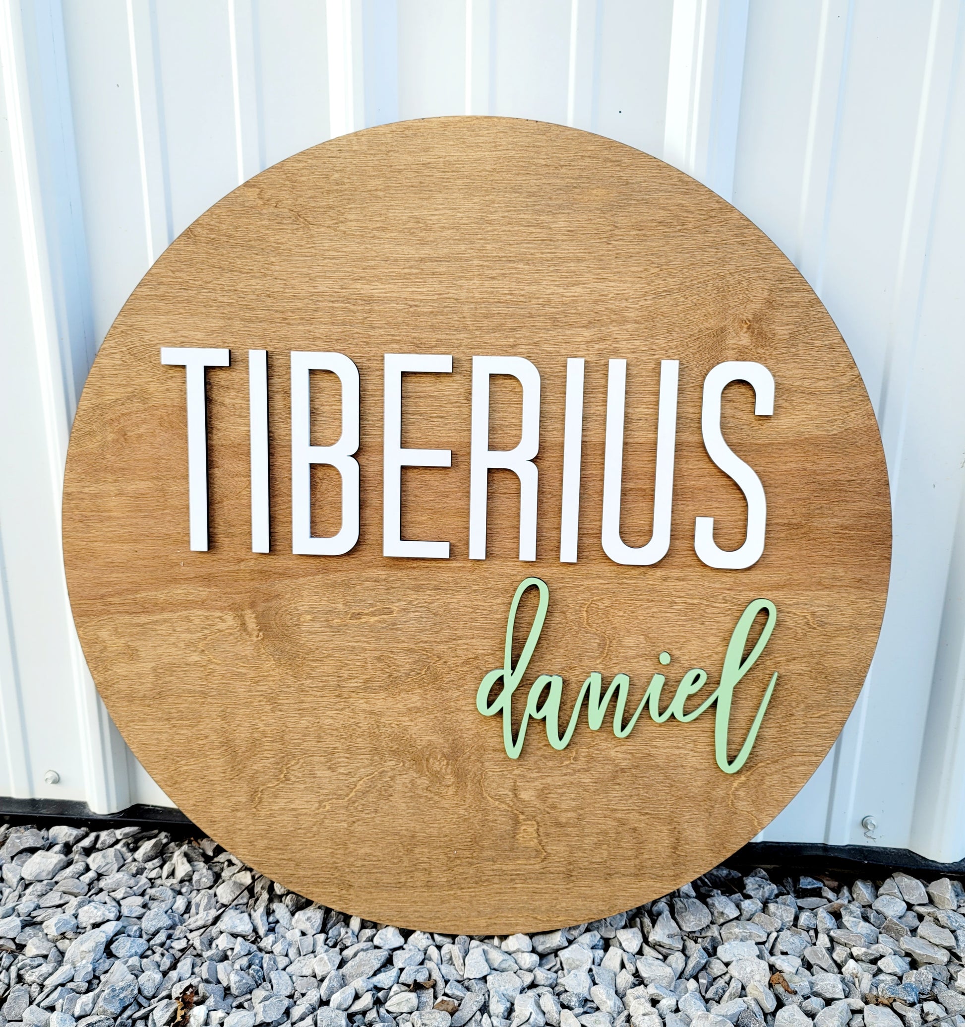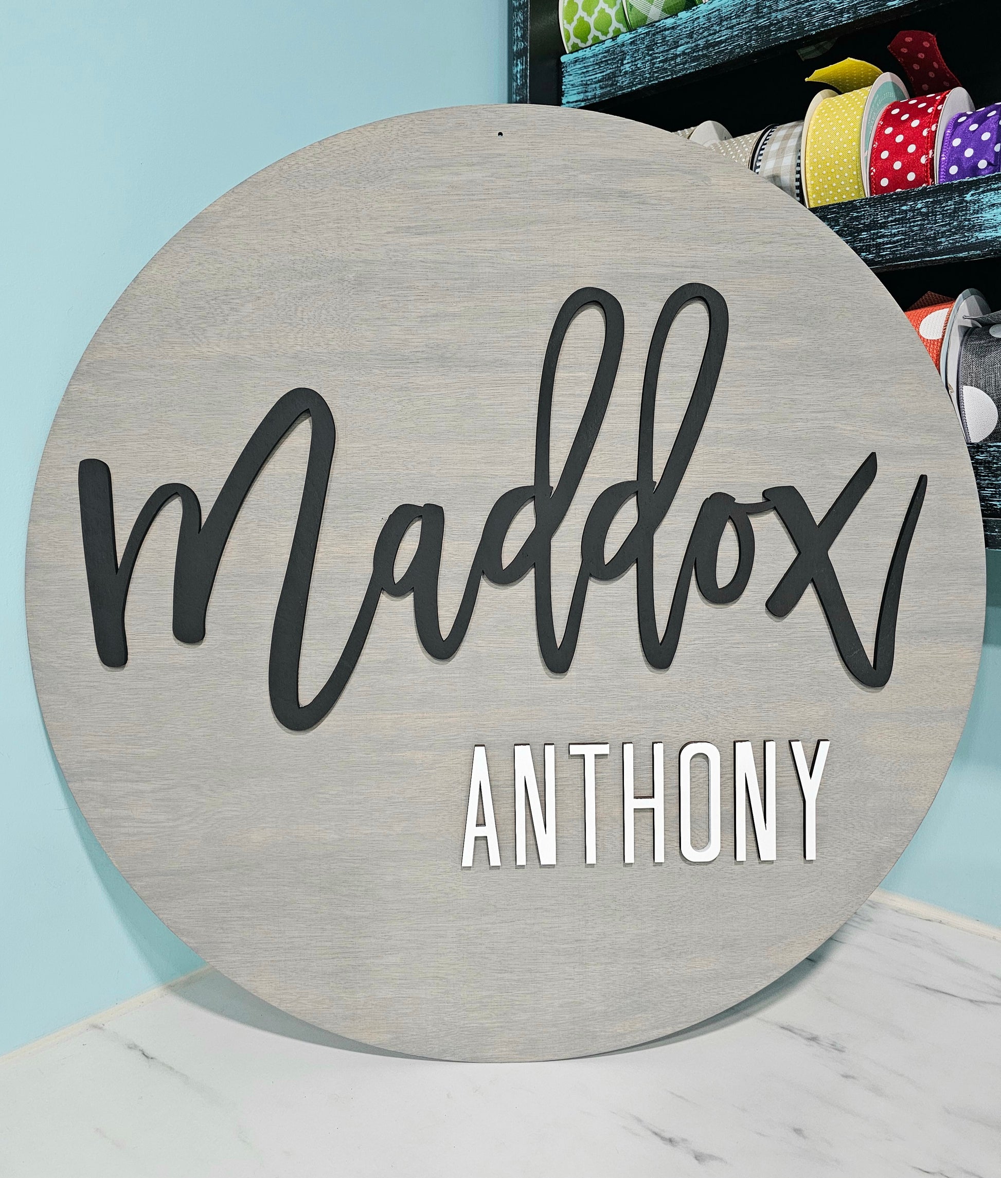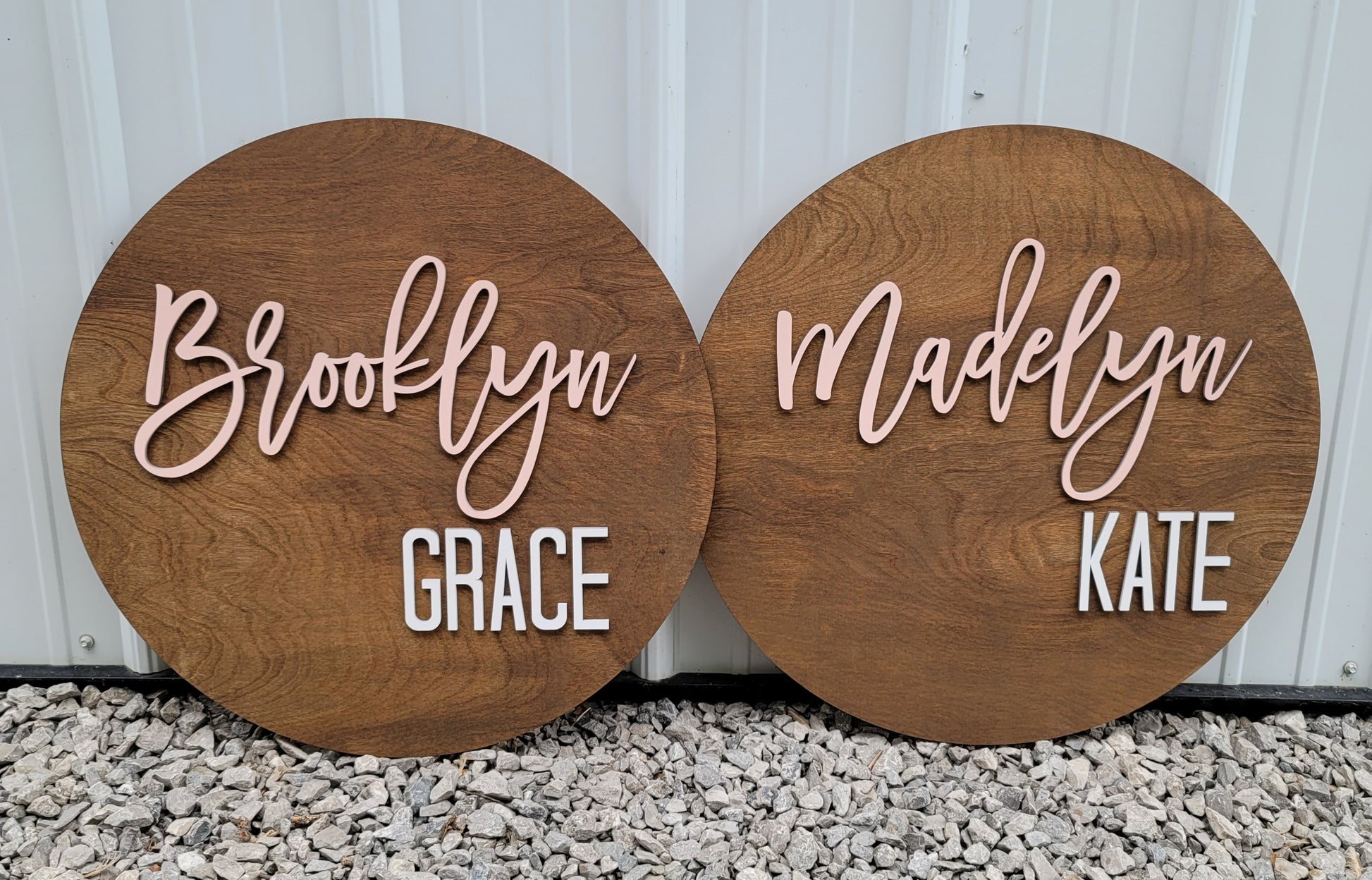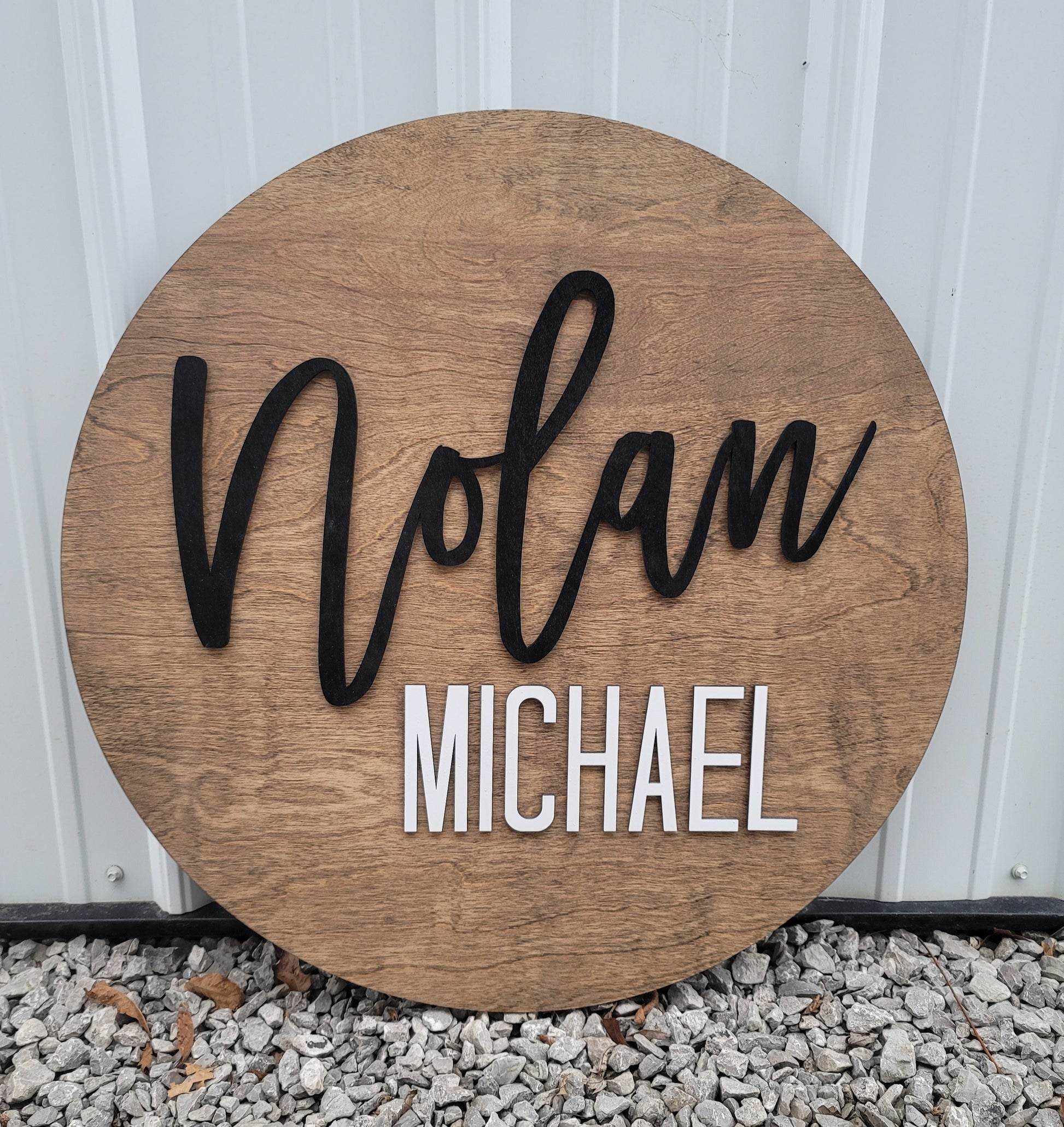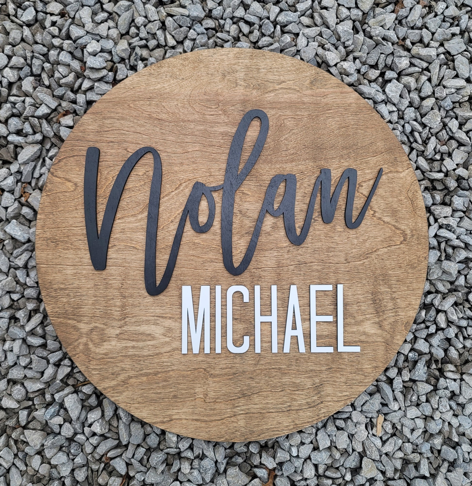 Beautiful, high quality 3d nursery sign that can be hung with double sided command strips as it is very light weight. The sign is available in 22" diameter OR 24" in diameter & is pictured with a dark walnut stain (you can choose your stain color). These letter are all 3d and are raised from the sign backing to give it a unique look with a simple black and white color. If you are wanting the names another color please list them in the name colors box when checking out. This would make a awesome baby shower gift!