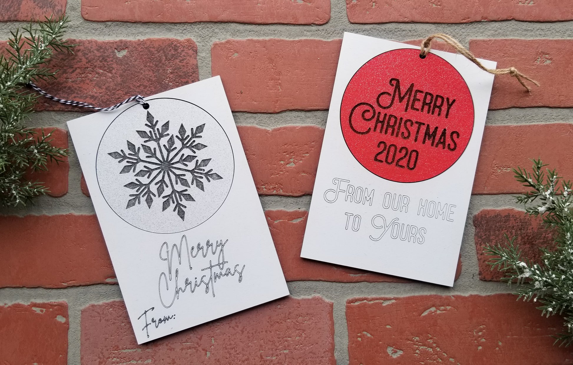Fun and unique way to give a Christmas Card and ornament at the same time. There are 2 designs to choose from and each complete card measures 7.5 x 4.5 and the ornaments inside the cards measure 4" in diameter.