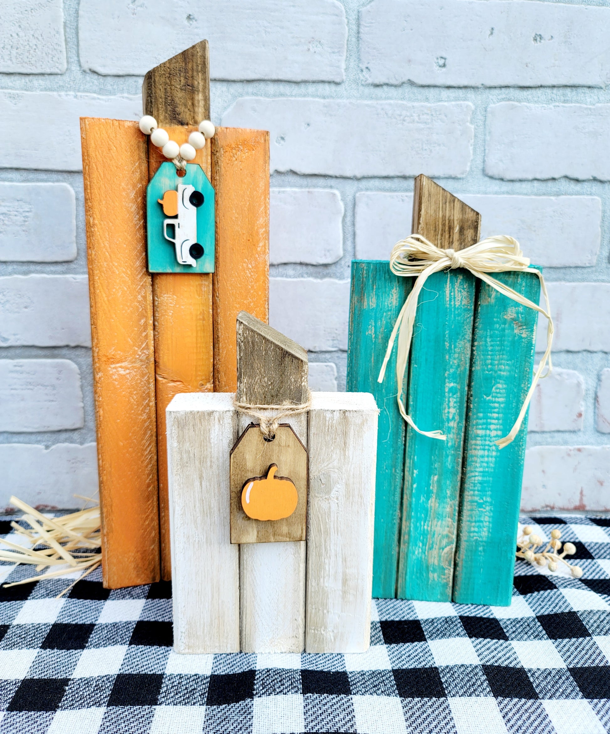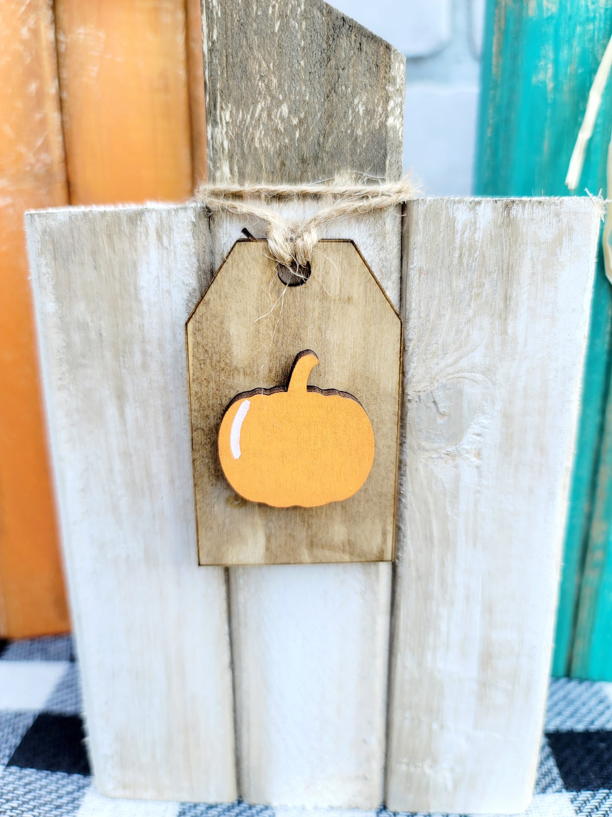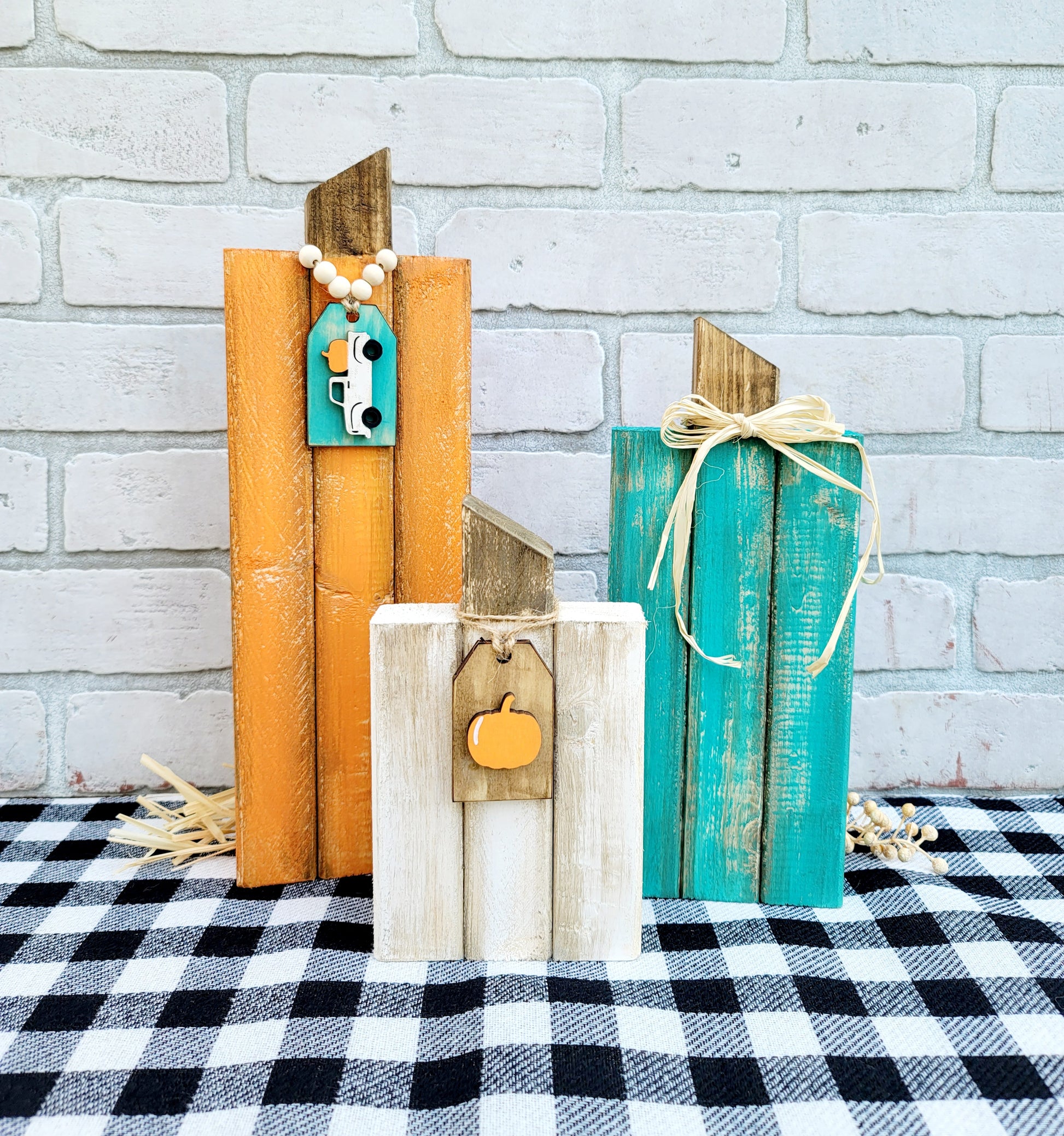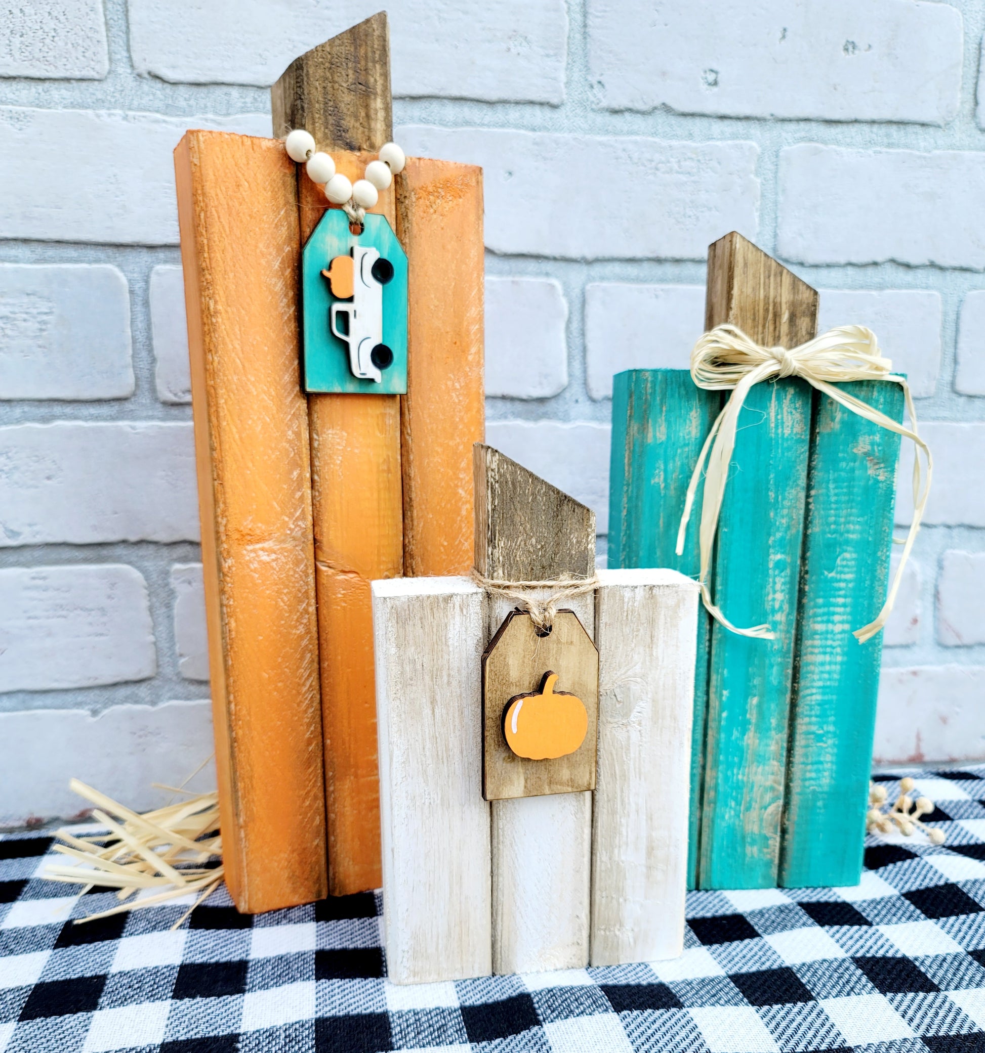 How cute is this trio?! Fun way to add fall to any room of your home! They measure 5.5", 8.5" & 11.5" tall. Painted option comes as pictured with tags and embellishments. The DIY Blank option is the wood pumpkin pieces unpainted and the wood tags unpainted and unassembled. Blank option does NOT include rope or beads. The possibilities are endless!