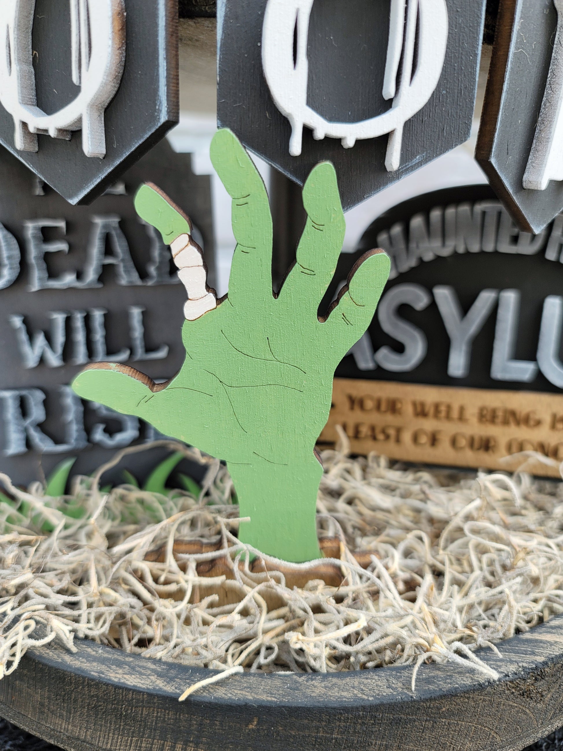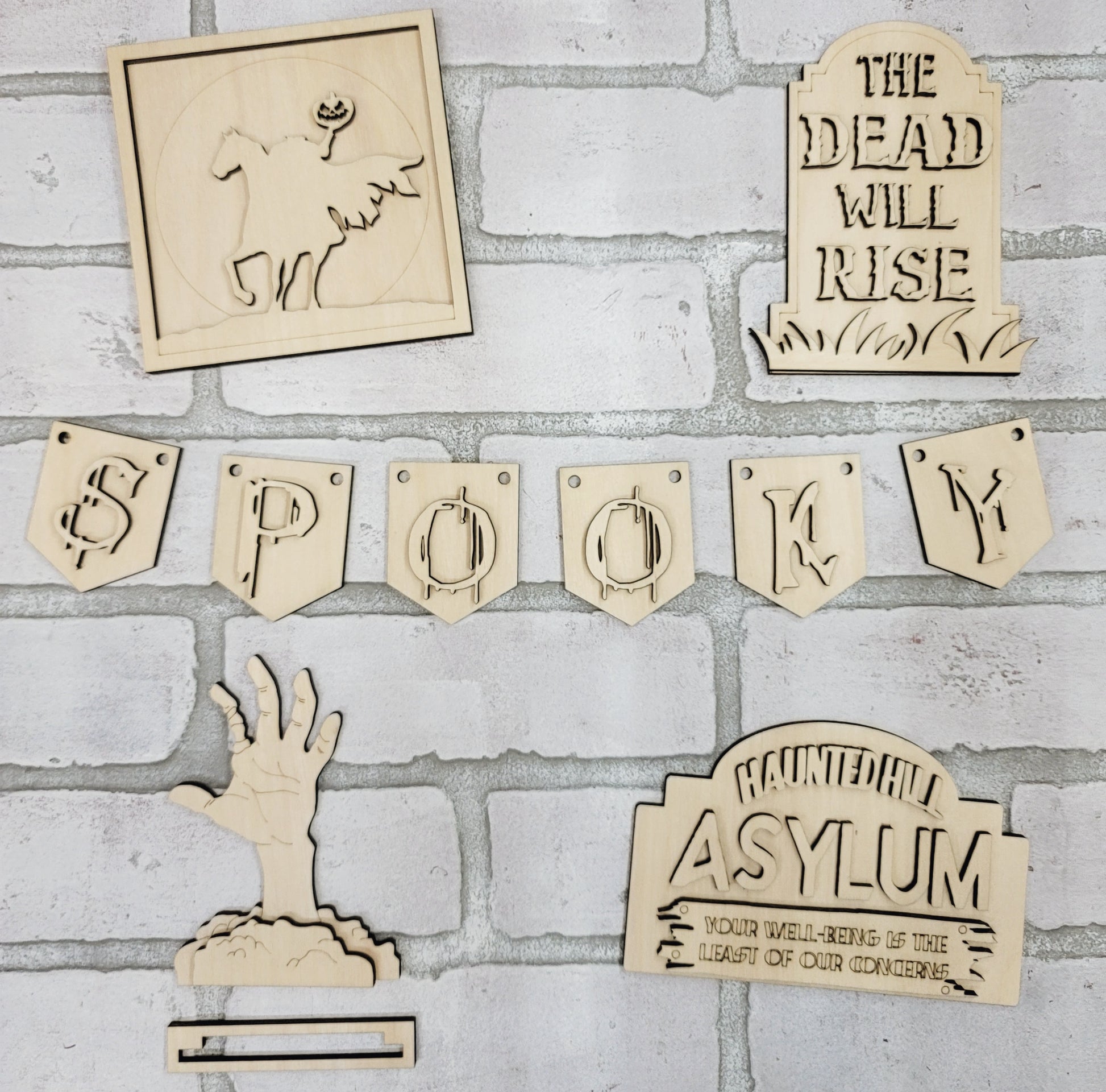 Having a Halloween party?! This would make the perfect Halloween addition to any room! This is a 5 piece set (wood pieces only- no props or tray) and is made with 1/4" wood. Each piece has different 3D elements. This is offered as a painted set or a blank set if your feeling crafty or your wanting to plan a girls night! Quantity is limited so don't miss out on this adorable tiered tray set!