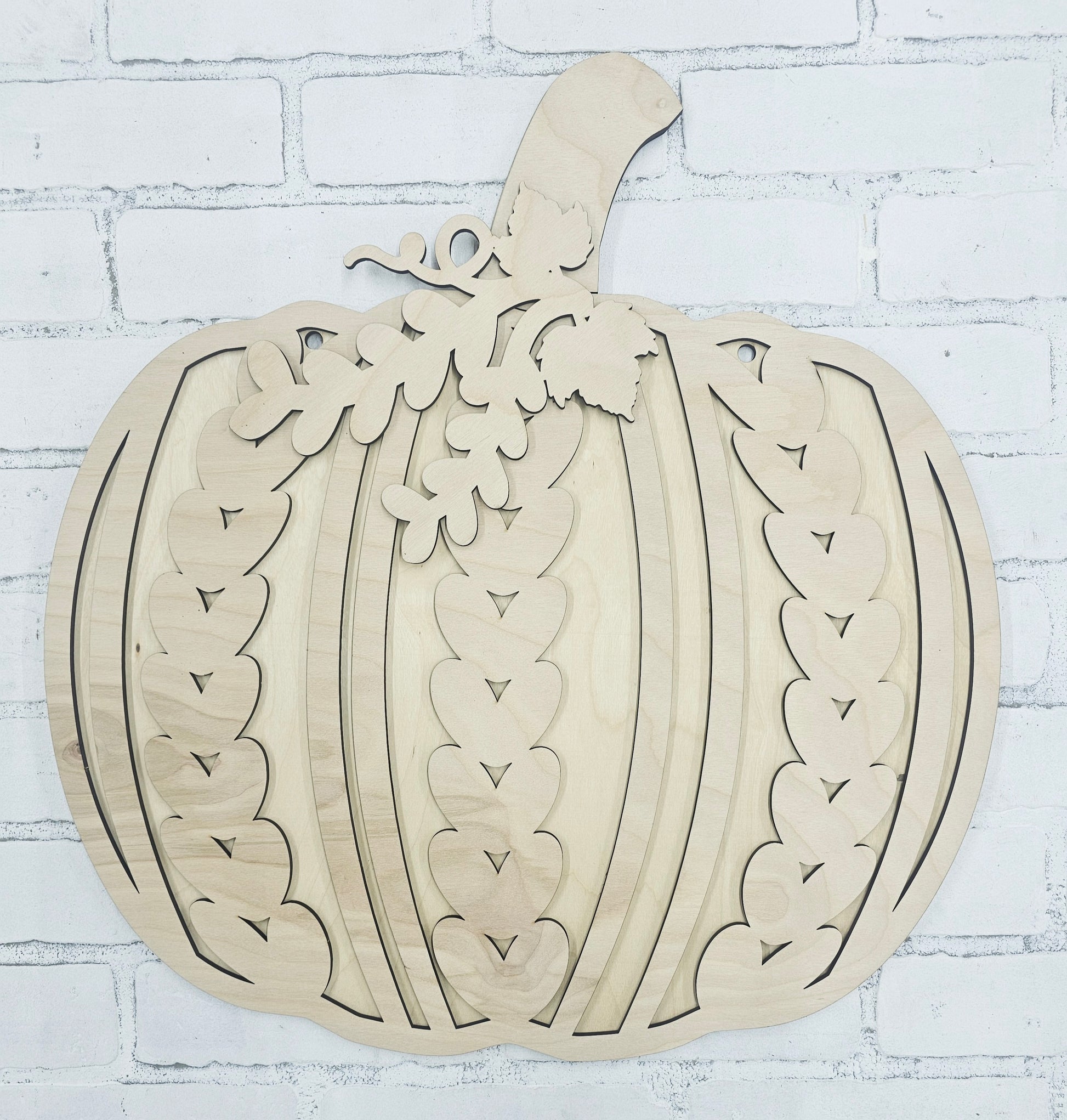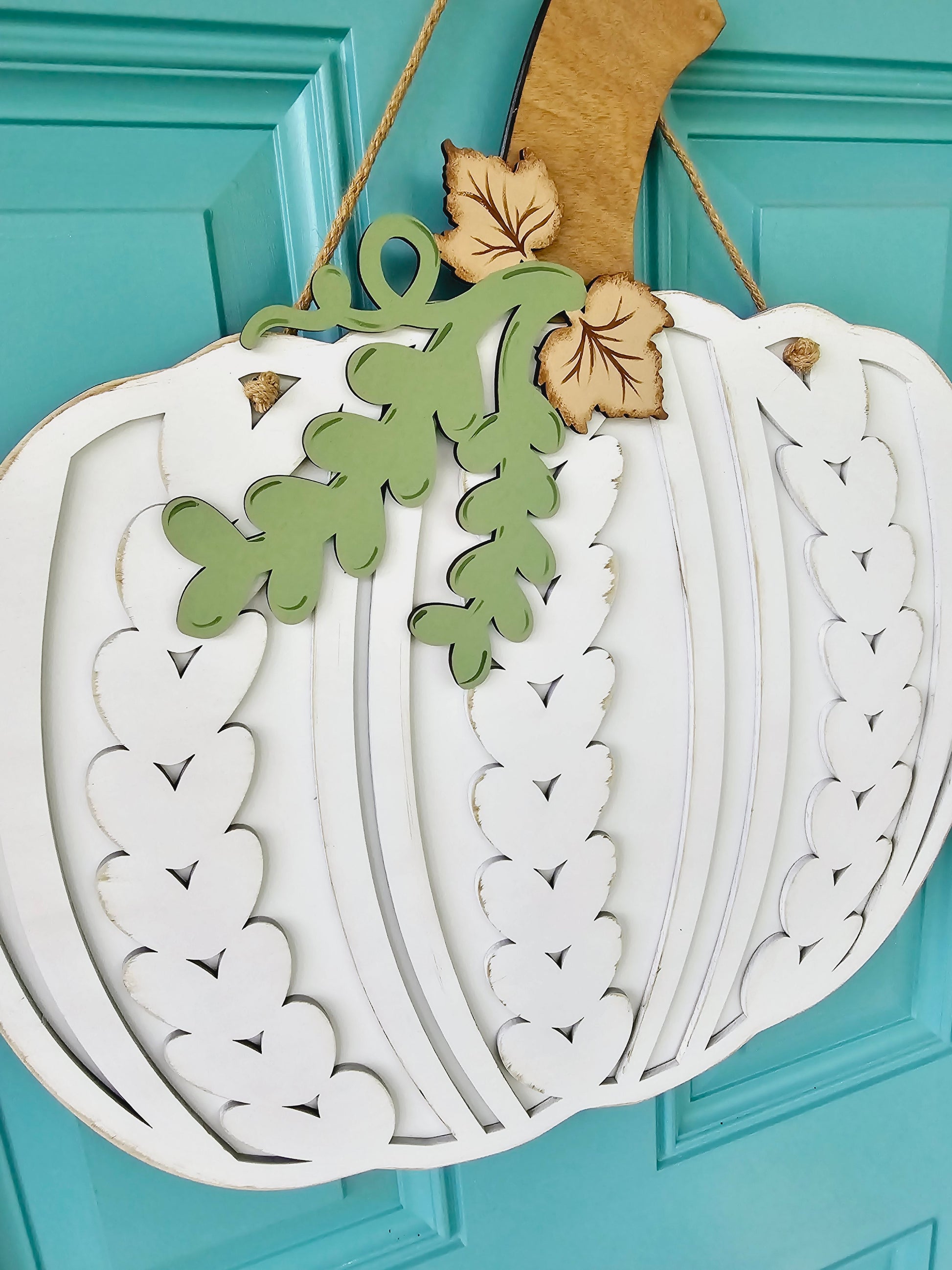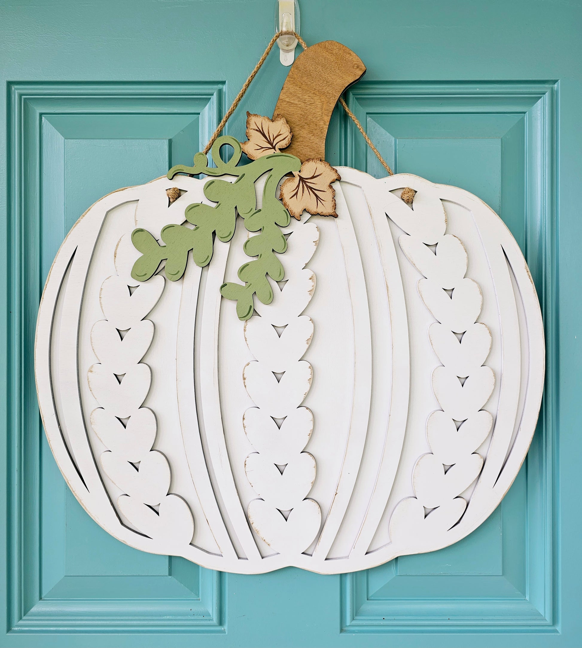 How adorable is this pumpkin door hanger?! This would make the perfect fall addition to any front door! This door hanger is 22" tall and is made with 1/4" wood. There is also an option to buy blank to get crafty or even host you own paint party with friends and family. (Blank option does not come with bow materials, just blank wood pieces)