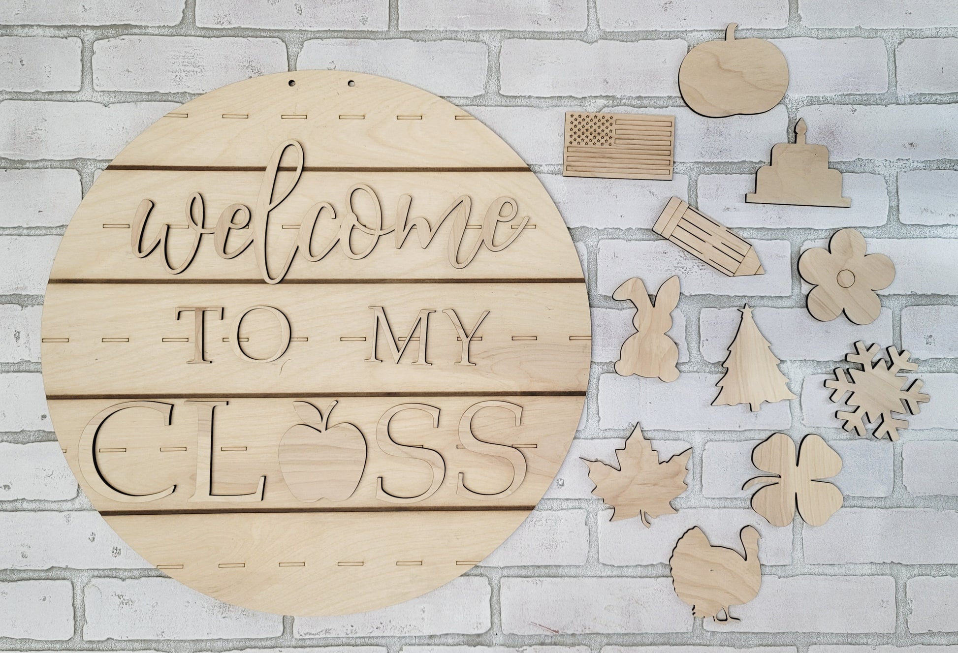 How fun is this sign for a teacher or classroom? This sign come with 12- 4" interchangeable parts. The overall sign measure 22" in diameter. All letters & pieces are 3d & painted option does come with bow. Great piece for all year round or to give as a teacher gift!