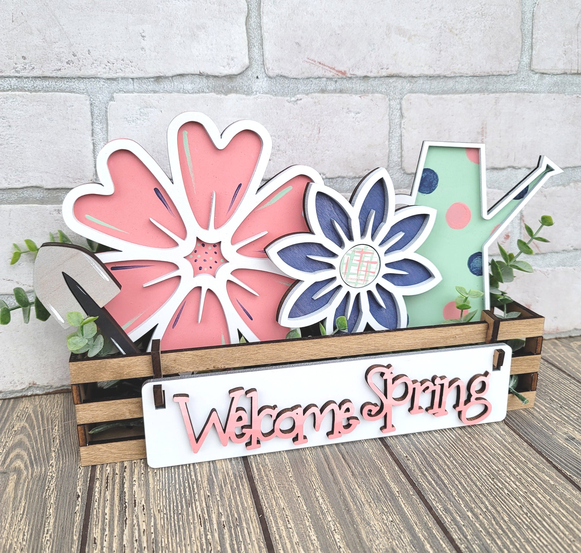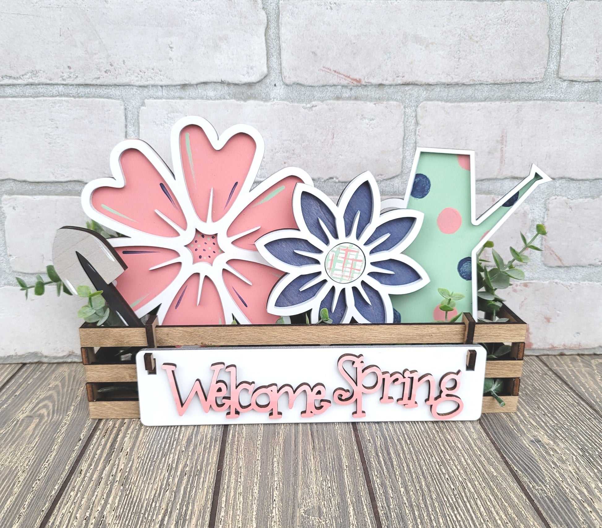 How cute is this set? Perfect spring addition for your interchangeable crate/shelf sitter! This set includes 5 pieces and the hooks to hang the welcome spring sign. These are offered painted or as a DIY Blank option for you to paint however you would like. This listing is for the inserts only. Crate/Shelf Sitter sold separately.